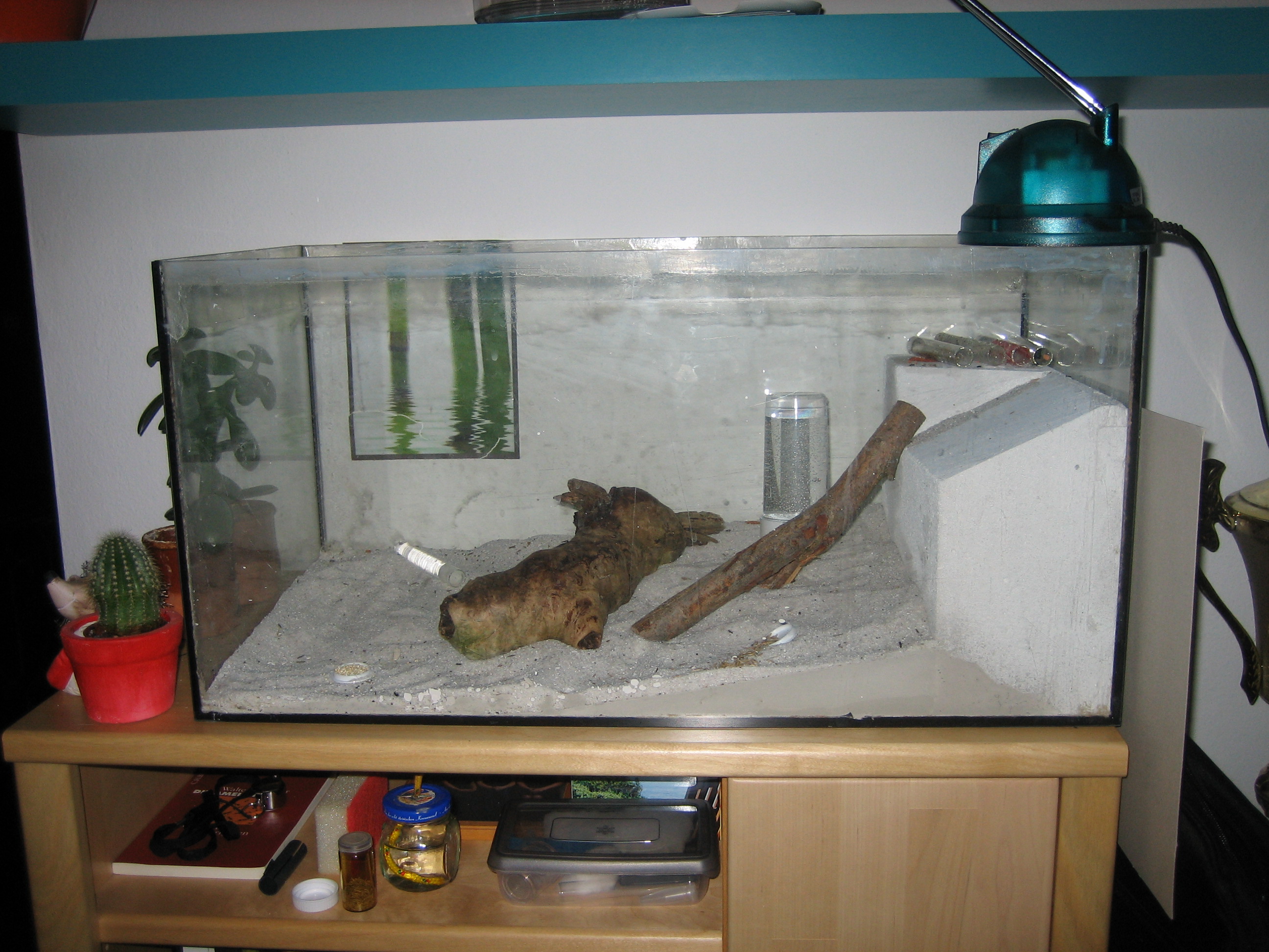 Alle wirken wohlauf, obwohl nur tagsüber beleuchtet wird (Lampe mit nur schwacher Wärmeabgabe) und das Zimmer sonst auch nicht übermäßig beheizt ist. Vormittags fällt allerdings auch etwas Sonne in die Arena. Das wird aber hoffentlich bald anders, wenn mal der Frühling einzieht.