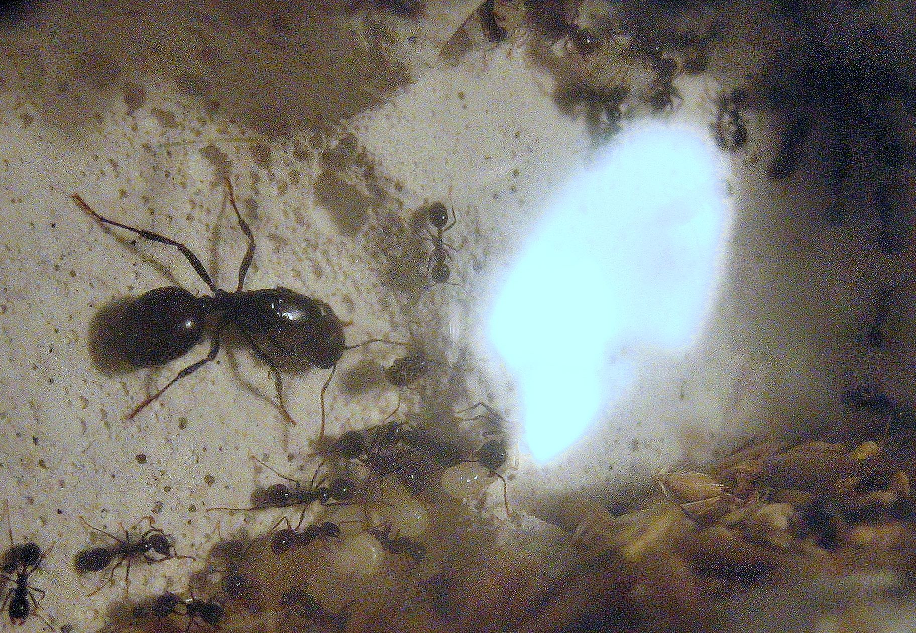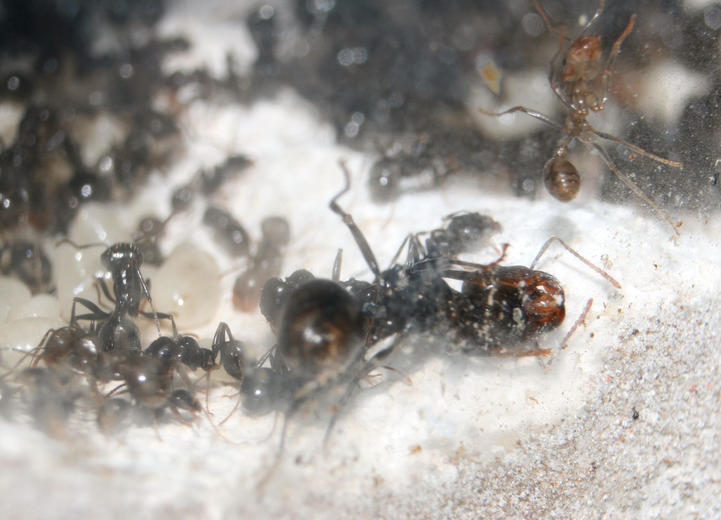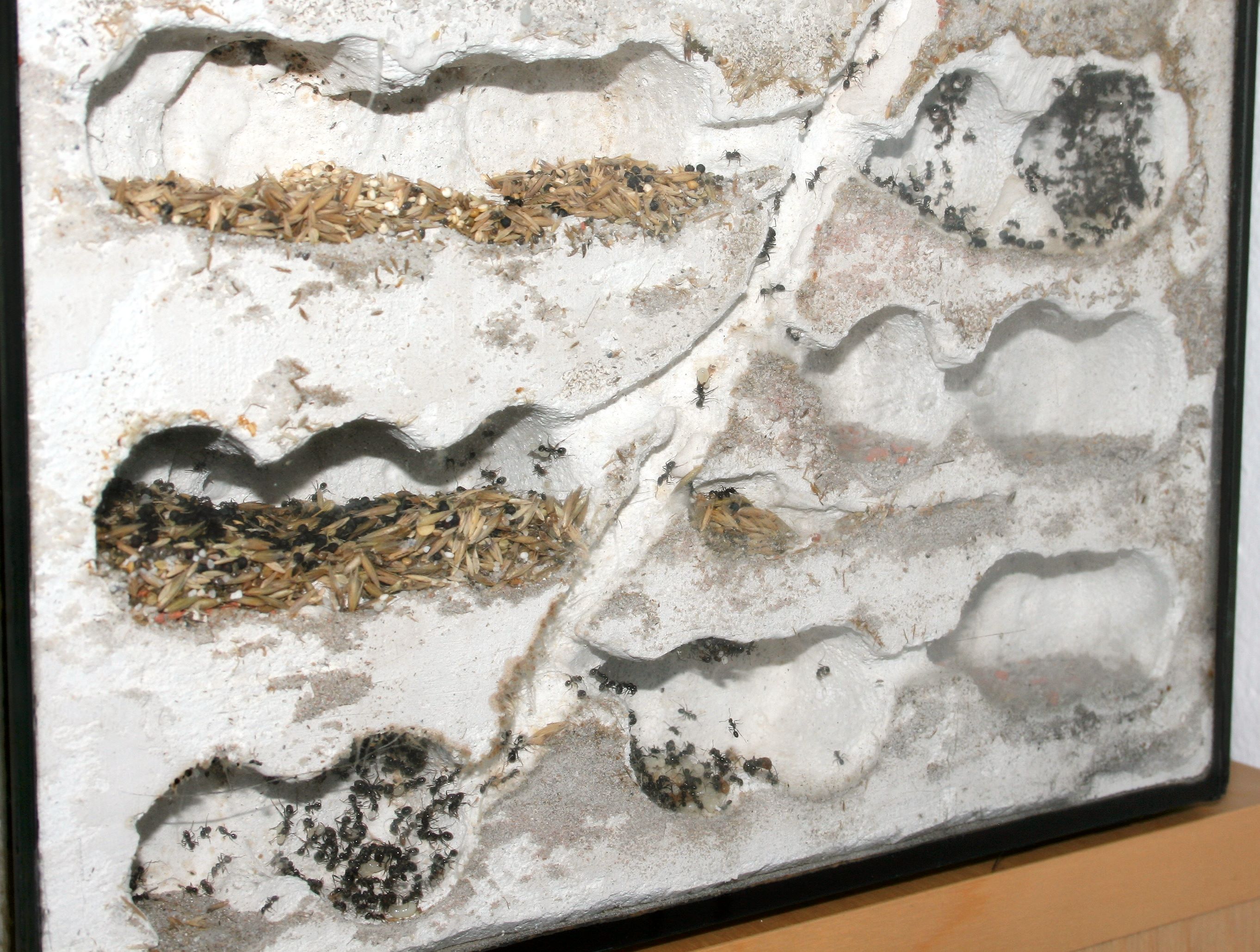 Die Ameisen sind aber dadurch jetzt in die unterste Etage gezogen und halten sich dort auf. Ansonsten sind sie aber wohlauf und pflegen die Brut.