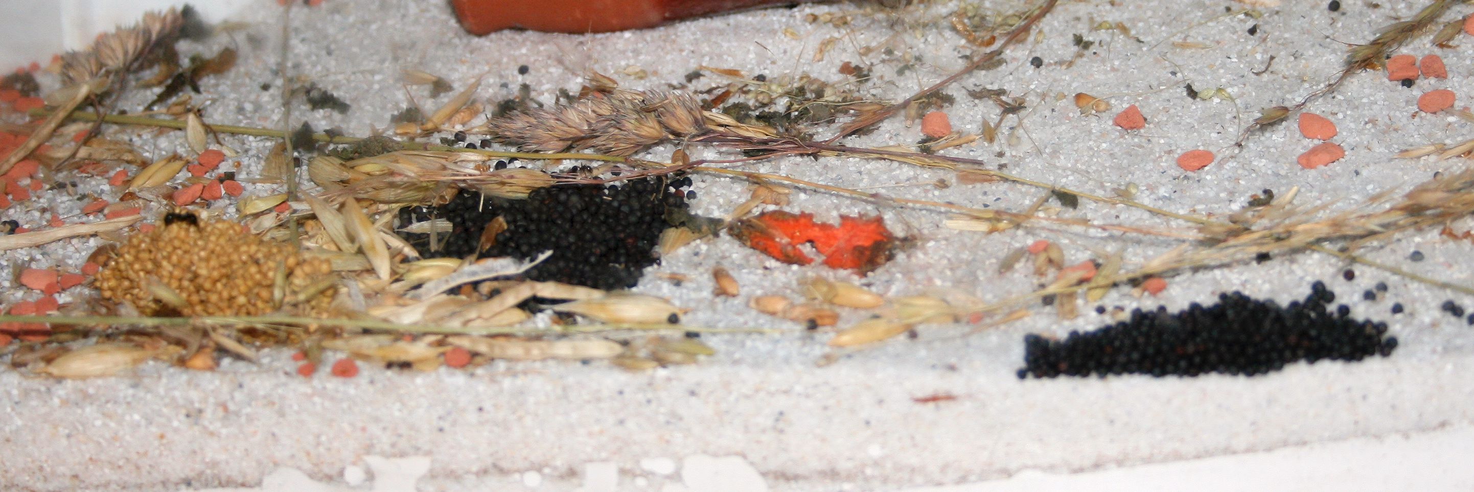 Die Ameisen furagieren nun wieder regelmäßig in der Arena. Nicht viele, aber wenn sie feststellen, dass etwas fressbares herumliegt, werden gleich einige weitere aktiviert und innerhalb kurzer Zeit wird jedes Körnchen ins Nest getragen. Da sie aber noch einiges in ihren Lagern haben, halte ich mcih etwas zurück damit.