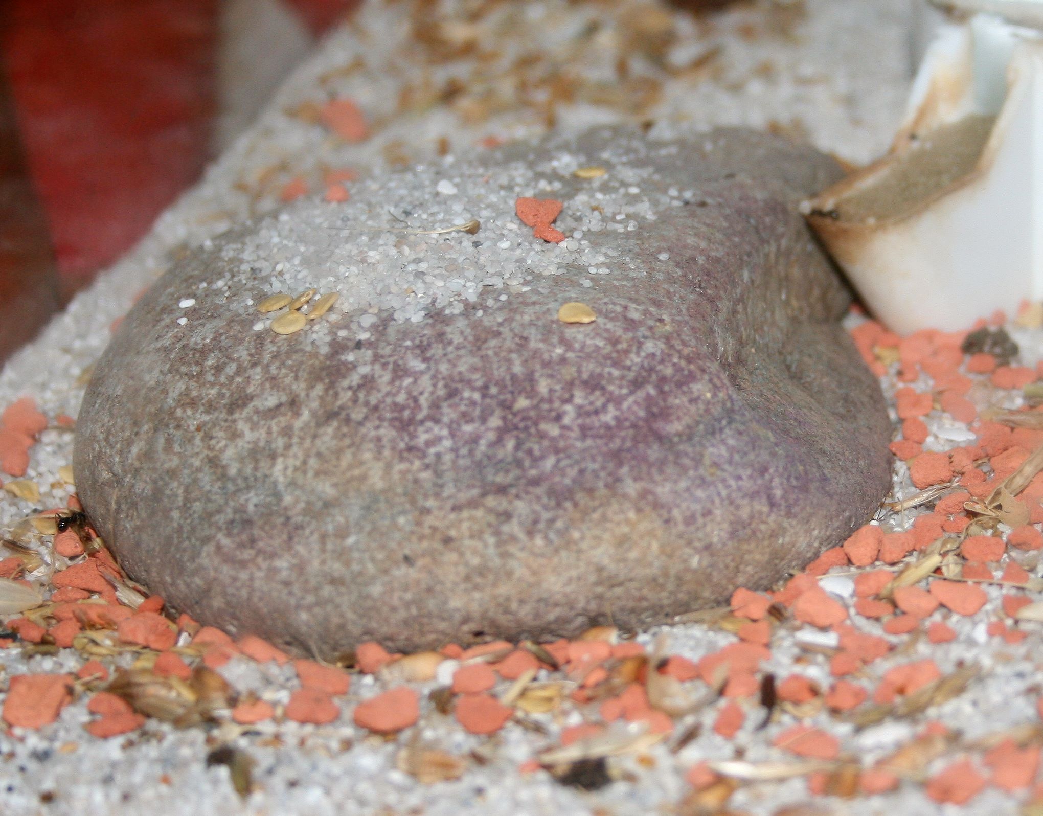 Was das mit dem Stein auf sich hat, ist mir ein Rätsel. Da werden schon seit Wochen immer wieder Sandkörner oben auf gelegt. Die Tage habe ich auch mal gesehen, dass tatsächlich auch drunter gegraben wurde. Wohl als Puppenlager?