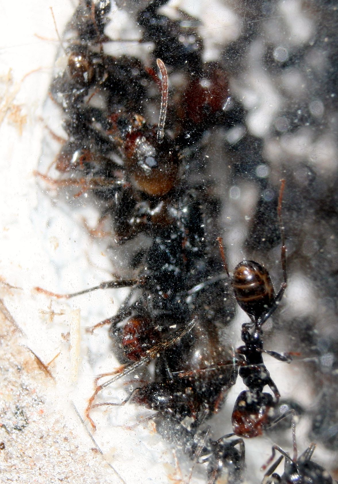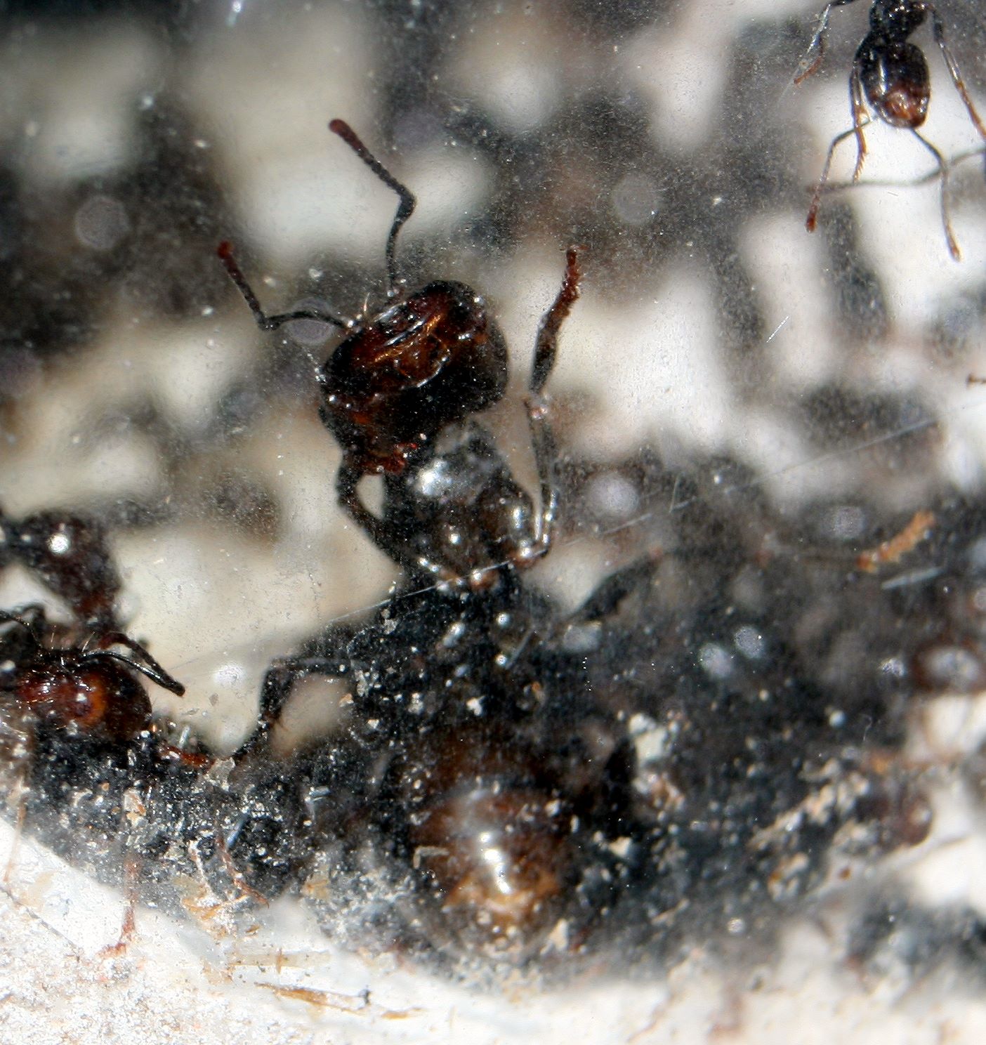 Ab und zu kann man welche erkennen, die in dem kleinen Spalt zwischen Nest und Scheibe herumkriechen. Kleinere Arbeiterinnen tasten sich auch dorthin vor, aber ob es die sind, die sie da rausholen, konnte ich noch nicht beobachten. Dass die größeren Majore nicht lange damit diskutieren, kann man sehen.