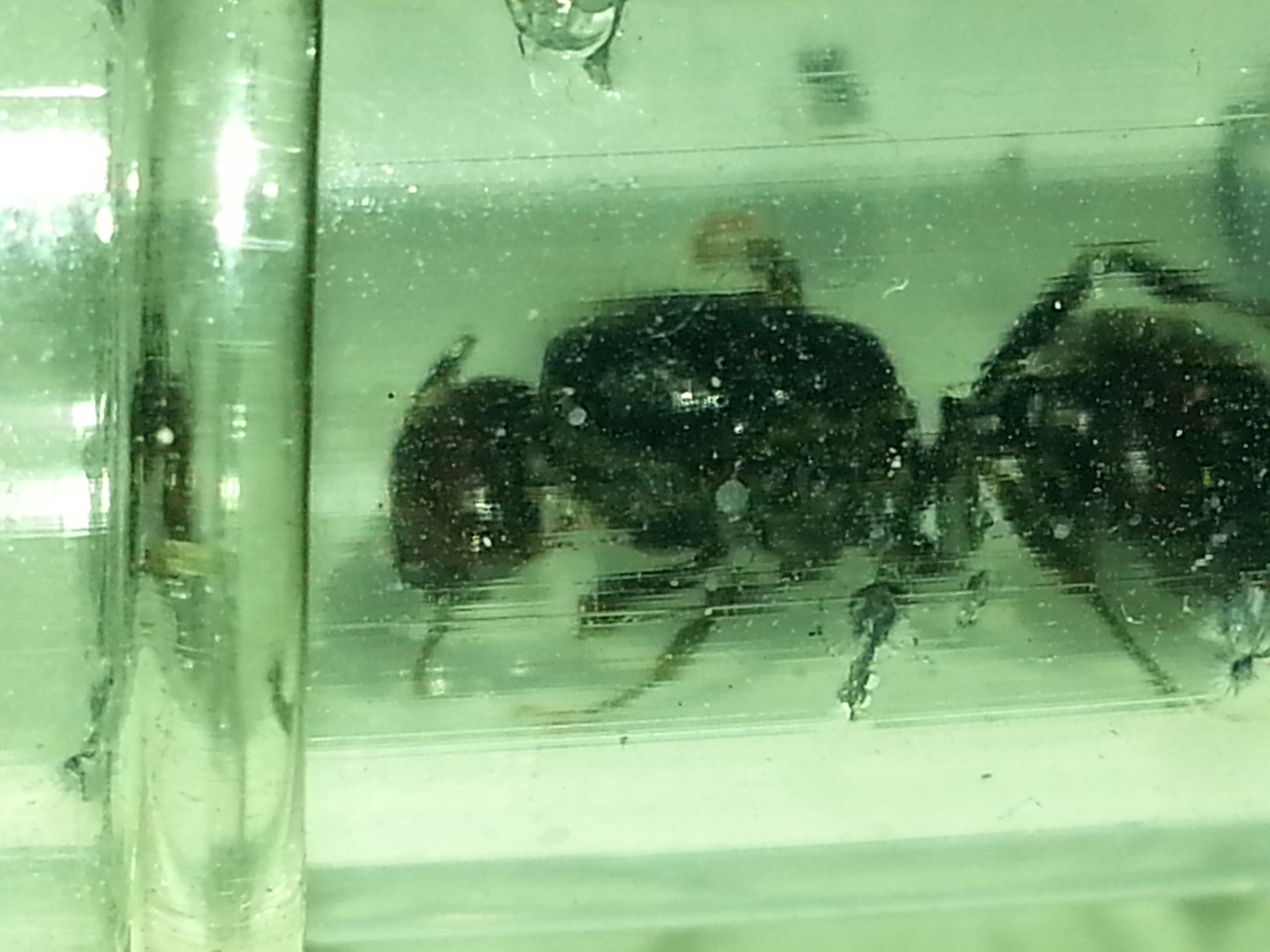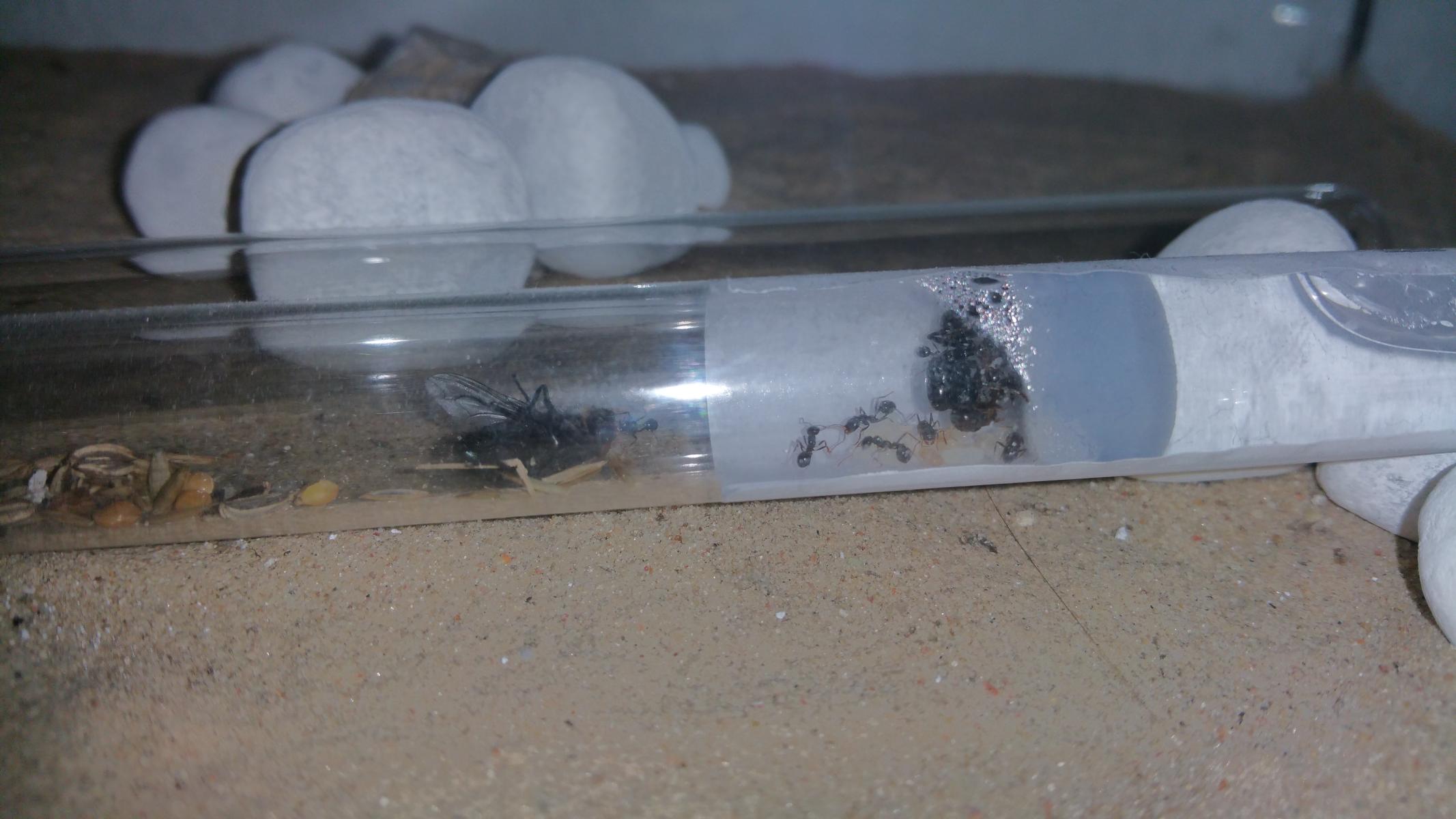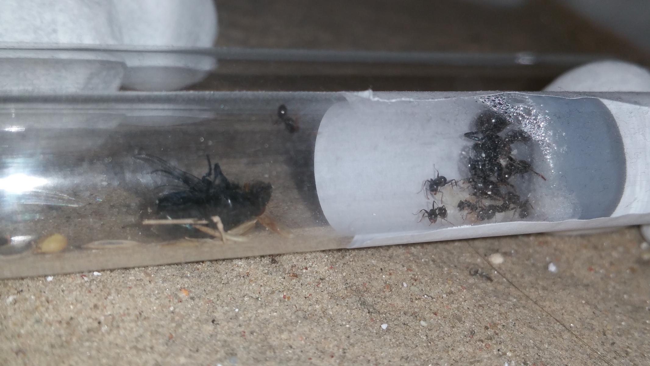 Heute gab es für alle Kolonien frisch getötete Fliegen und auch die Messor haben etwas abbekommen, obwohl ich nicht geglaubt habe, dass die kleine Kolonie viel damit anfangen kann. Zu meiner Überraschung haben sie die Fliege einfach in ihr Reagenzglas gezogen :).