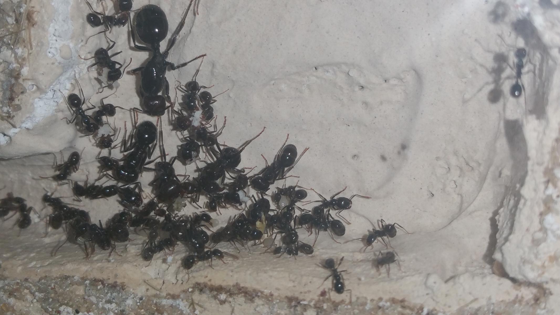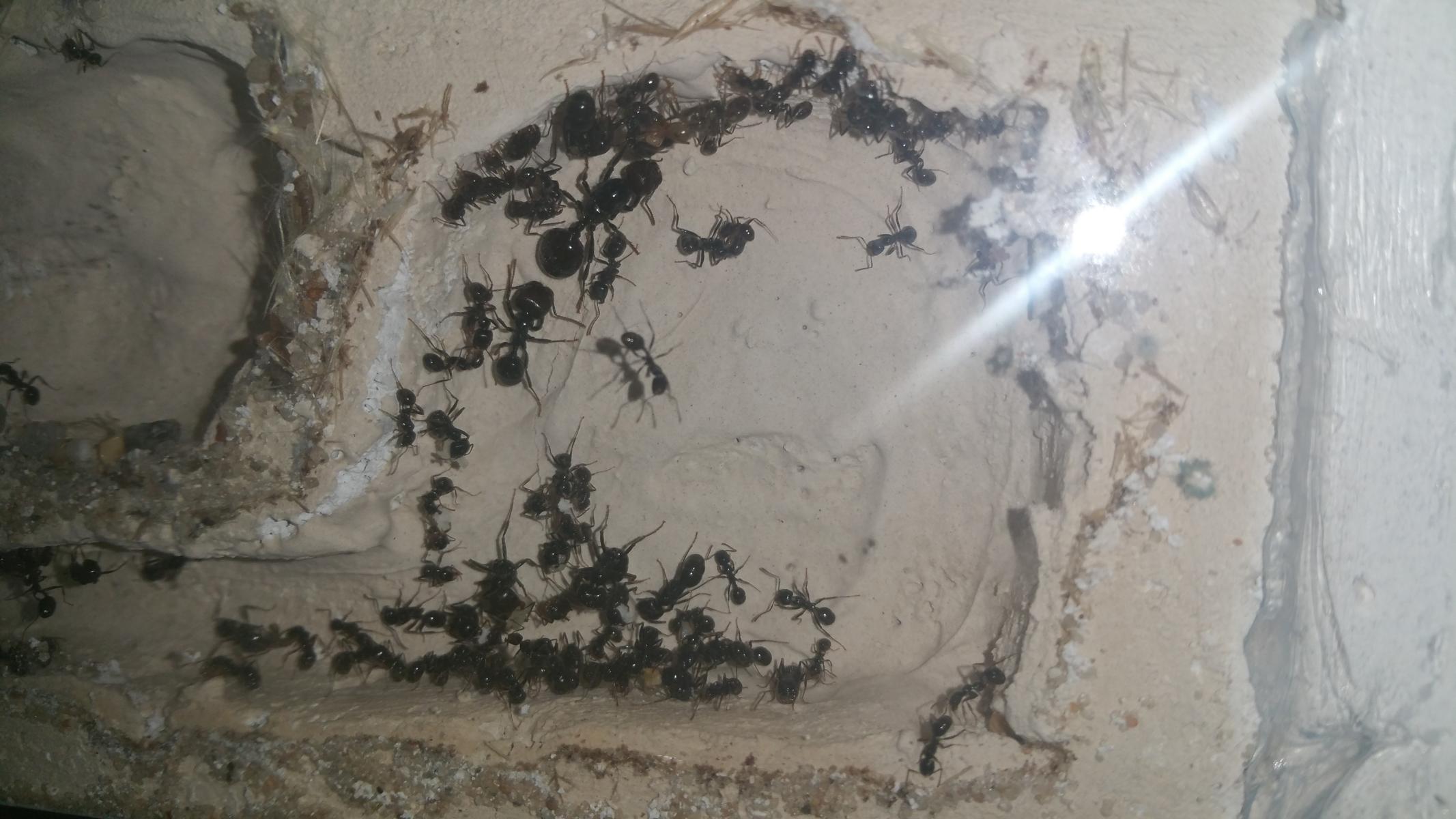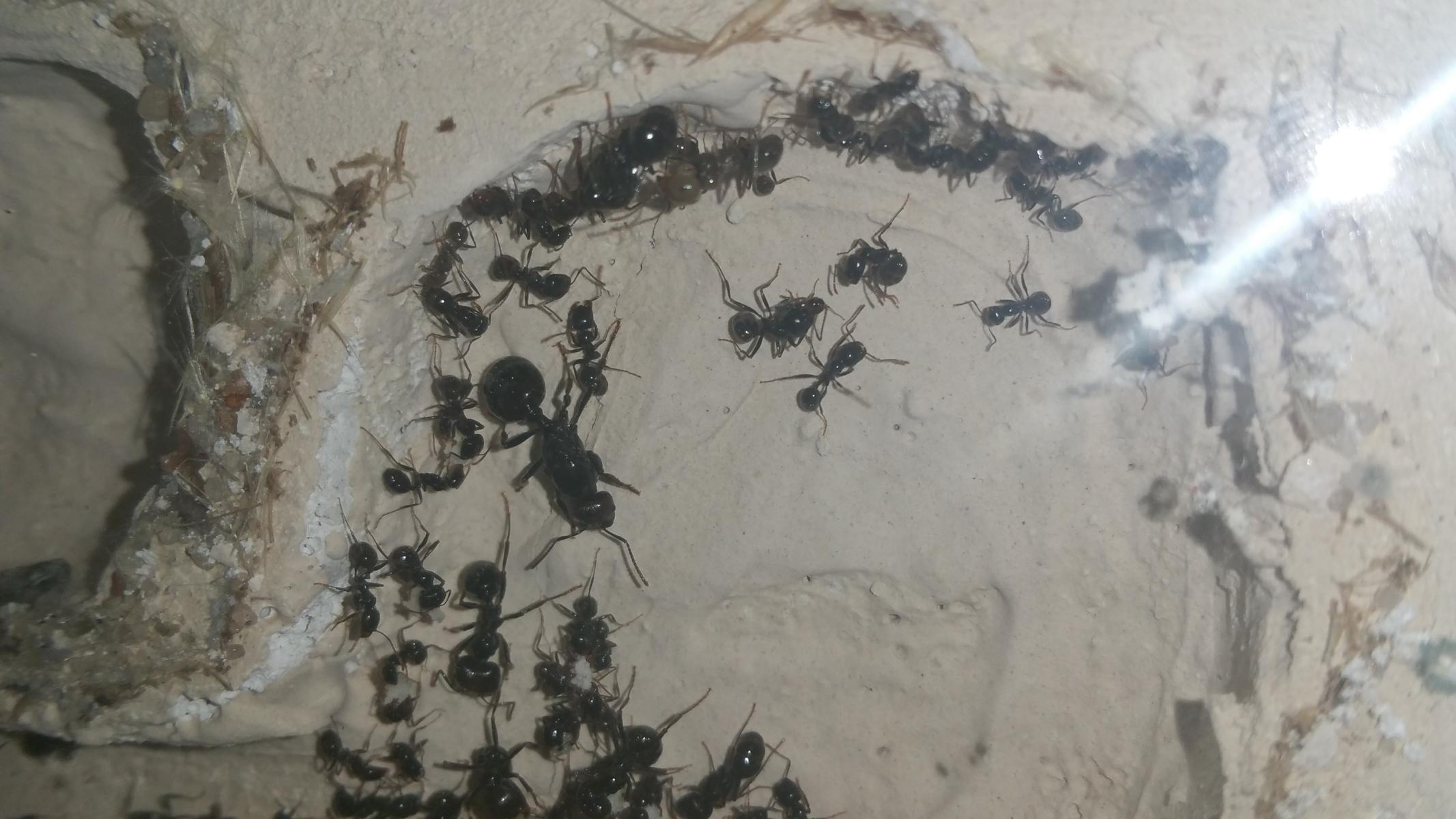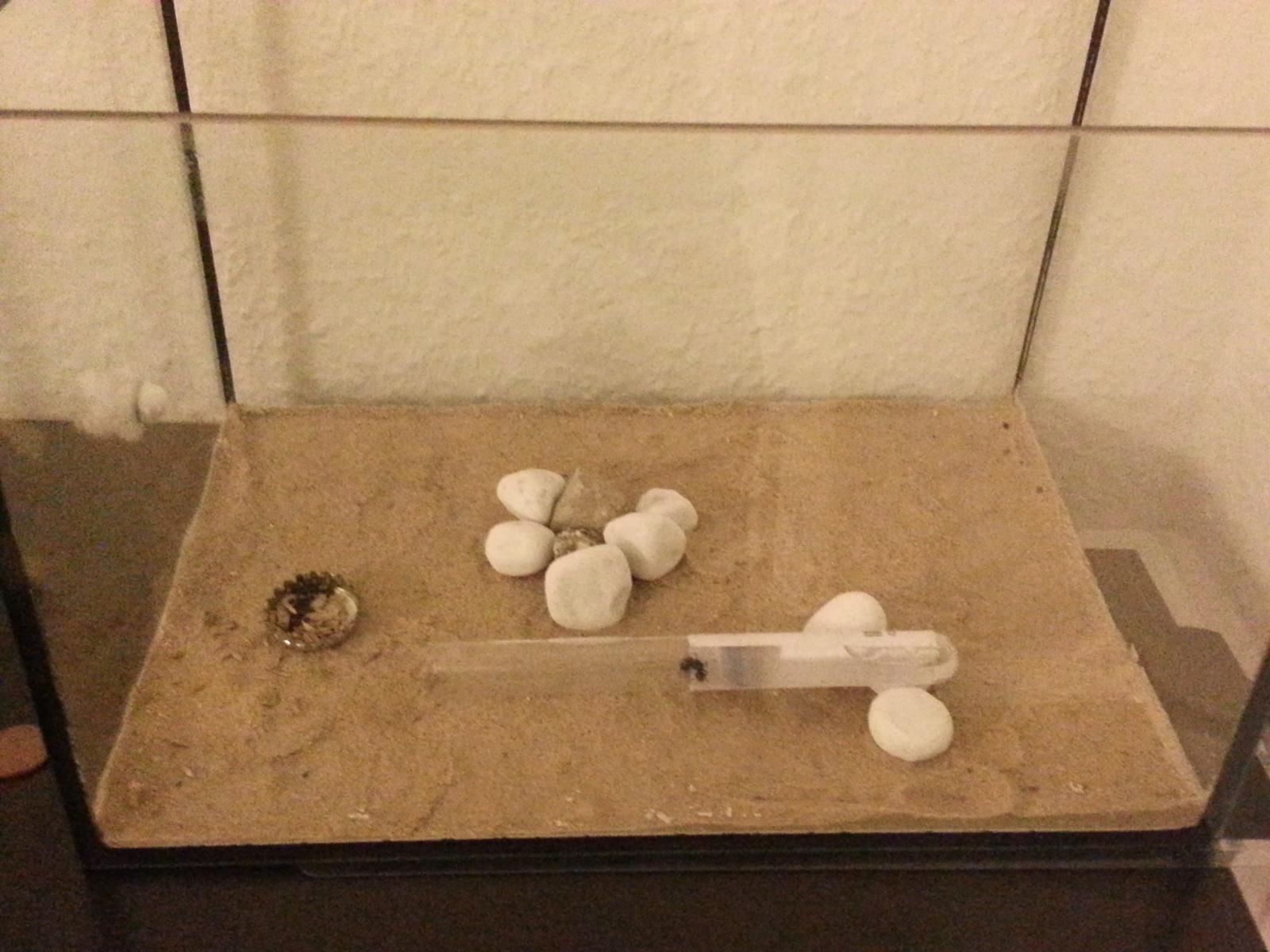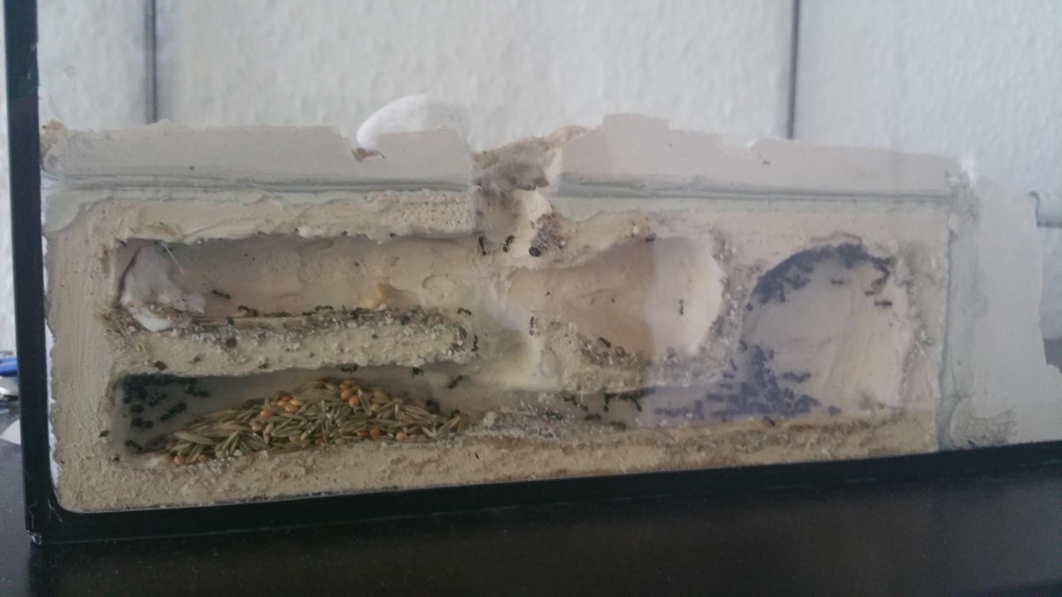Nachdem ich im Sommer das aktuelle Becken schon einmal in Benutzung hatte, die Kolonie aber noch nicht umziehen wollte, sondern lieber in ihrem Reagenzglas blieben, haben sie ein sehr einfach eingerichtetes Becken bekommen in dem sie immer weiter gewachsen sind. Nach und nach haben sie den Nanostopfen zum Wassertank durchgeknabbert, aber der Tank war eh so gut wie leer und scheinbar brauchten sie nur ein wenig mehr Platz. Mittlerweile bin ich bei ca 100 Arbeiterinnen und die ersten Majore sind auch schon da. Ich habe das neue Becken wieder angeschlossen und diesmal sind sie innerhalb von Stunden komplett umgezogen. Die Körnerlager sind gefüllt und es gibt kaum noch Brut (ich hab nen paar Larven entdeckt beim Fotografieren). Die Heizmatte ist schon seit Wochen aus und in 2 Wochen werde ich sie in die kältere Küche stellen.