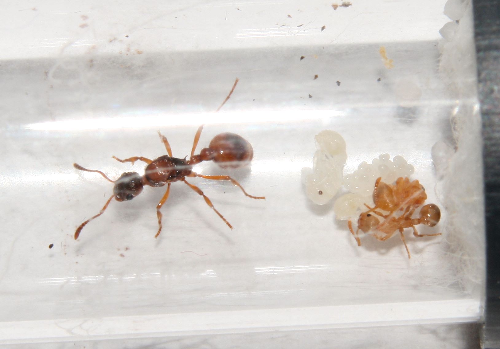 Ich habe versucht, sie möglichst wenig zu stören, aber inzwischen ist bereits eine Puppe, eine größere Larve und einige Eier vorhanden. Die Gyne wirkt sehr vital.