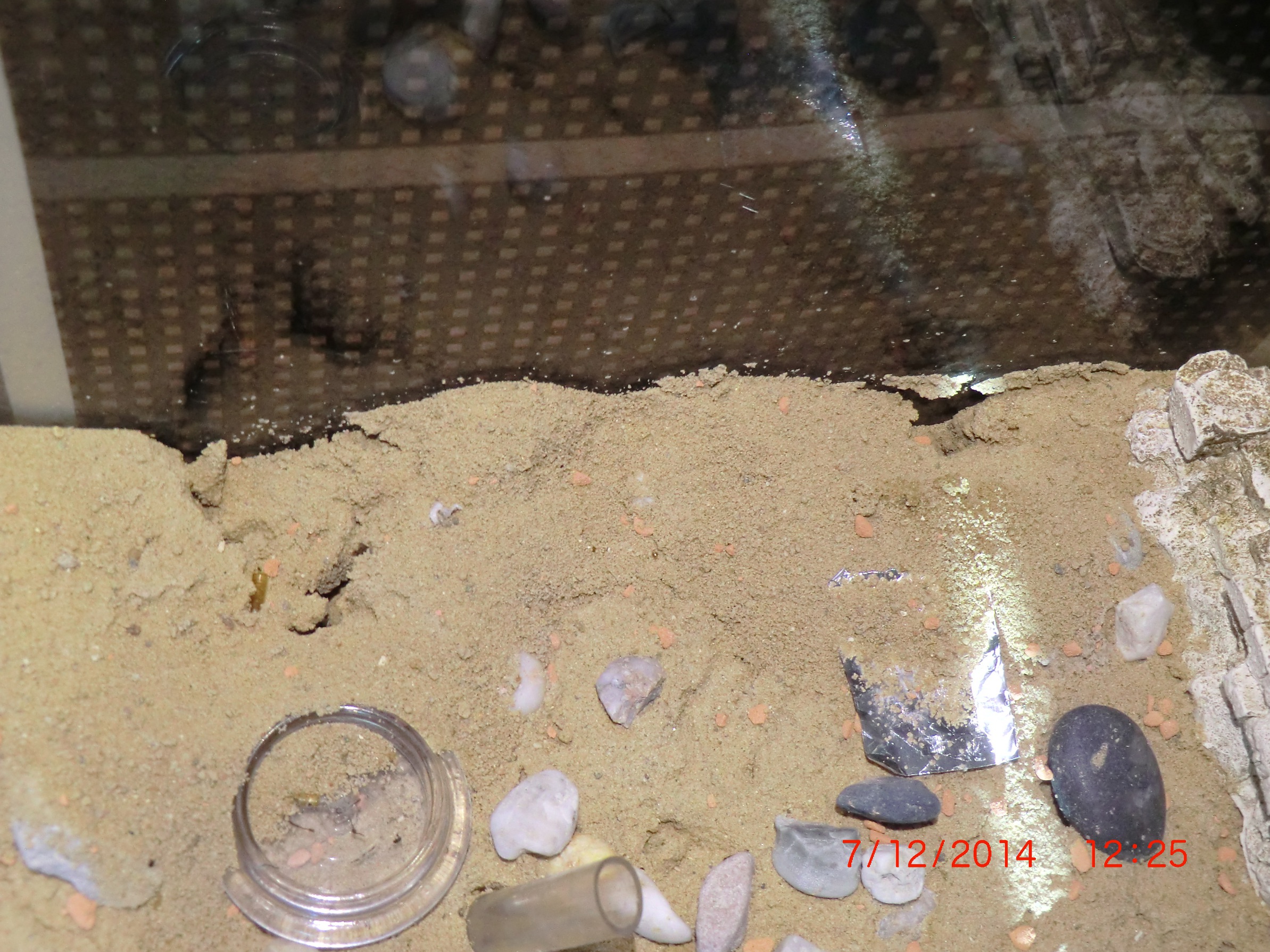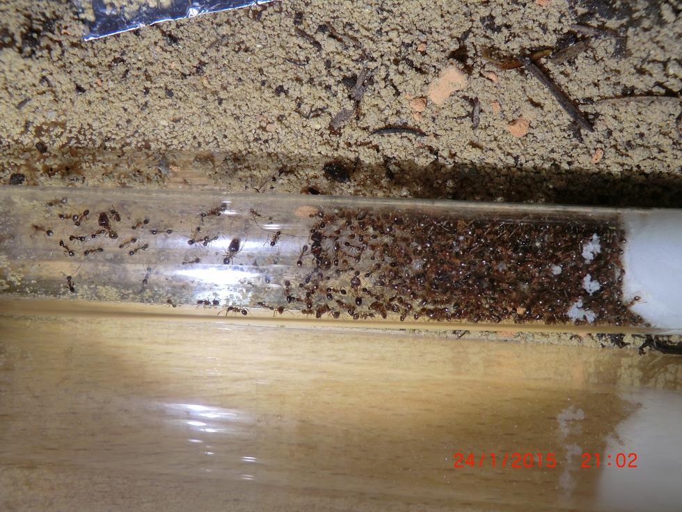 Sie leben nun schon seit ca. 5 Monaten bei mir und ich muss sagen diese Ameisen machen mir viel Freude. Bei jeder Fütterung kommen unzählige Ameisen zum Vorschein, doch Soldaten sieht man eher selten. Sie haben schon das gesamte Becken umgegraben und 3 Ausgaänge angelgt. Einer ist bei der Pflanze die anderen beiden sind an der Scheibe. Befeuchten tue ich das ganze mit einer Sprühflasche einmal die Woche. Auch da strömen die kleinen aus dem Nest um alles wieder zu abzusuchen.