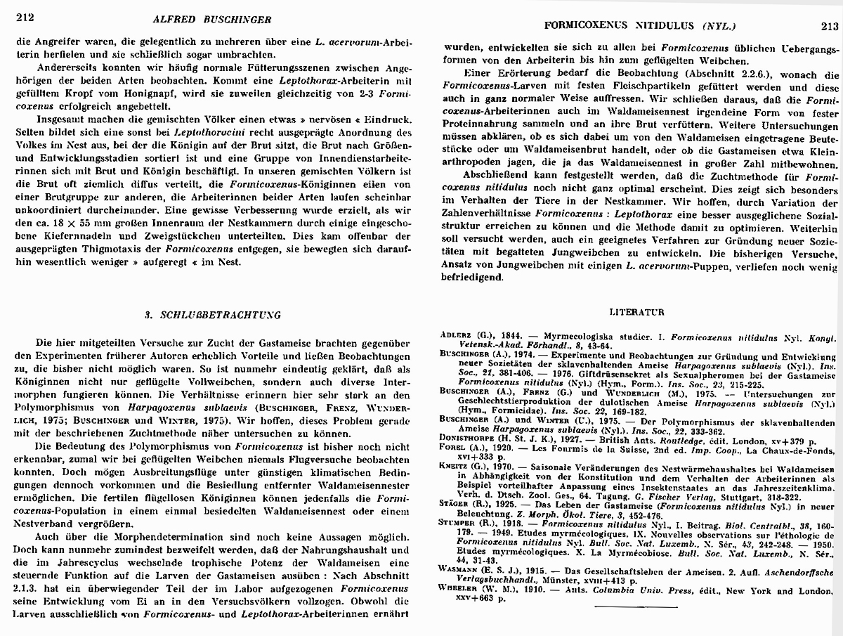 Buschinger, A. 1976: Eine Methode zur Zucht der Gastameise Formicoxenus nitidulus (Nyl.) mit Leptothorax acervorum (Fabr.) als «Wirtsameise» (Hym., Form.). Insectes Sociaux 23(3):205-213.