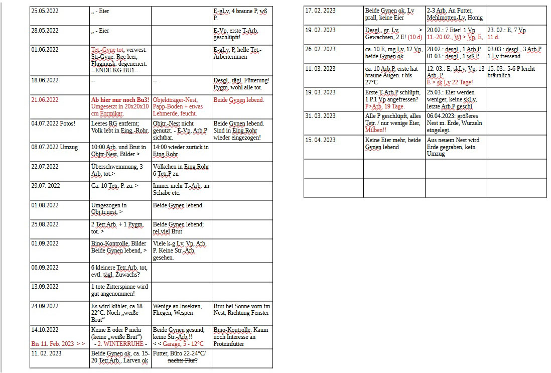 Es entstanden keine Str.-Arbeiterinnen, obwohl die letzte Kolonie zweimal überwintert wurde. Zuletzt traten Milben auf (in den Foren wären sie als „harmlose Futtermilben“ identifiziert worden!). Offenbar haben sie die reichlich neu gelegten Eier gefressen.