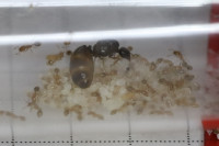 Bei der "Frühjahreskontrolle" Anfang Februar lag die Gyne seitlich auf dem Reagenzglas Boden. Ich machte mir wenig Hoffnung und nahm das RG ins Warme. Kurz darauf bewegte sich die Königin - eher ungeschickt. Mitte Februar entdeckte ich ein Eipaket am Behälterboden, die Gyne kippte wegen meiner Störung wieder zur Seite und das Eipaket blieb an ihrer Gaster kleben. Sie drehte sich mehrmals und bog das Hinterteil nach vorne, konnte aber nicht an die Eier gelangen. Ich habe noch nie eine so tollpatschige Ameise gesehen, fuhr es mir durch den Kopf.