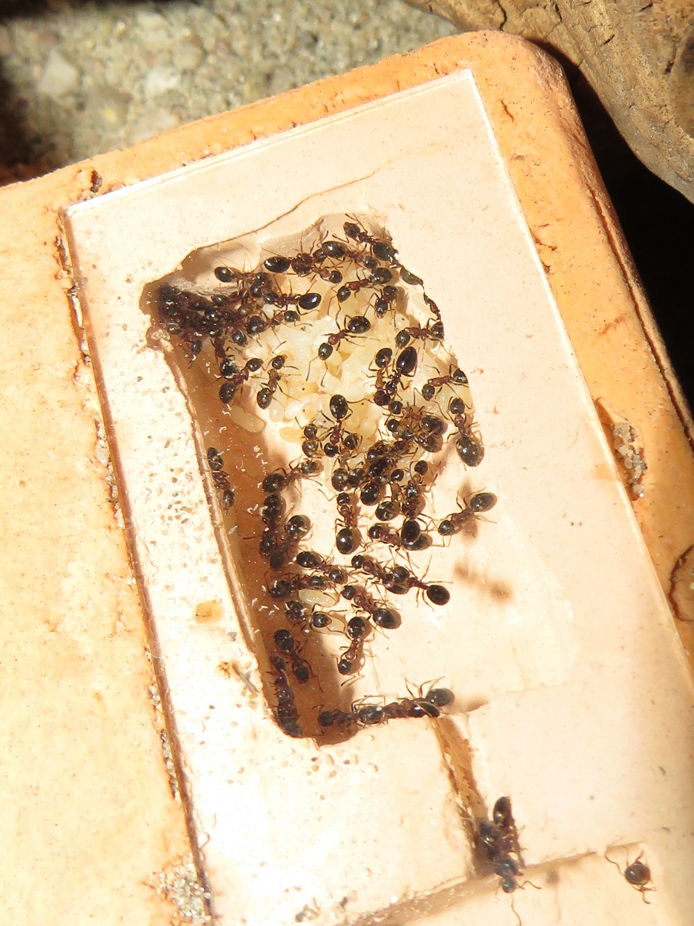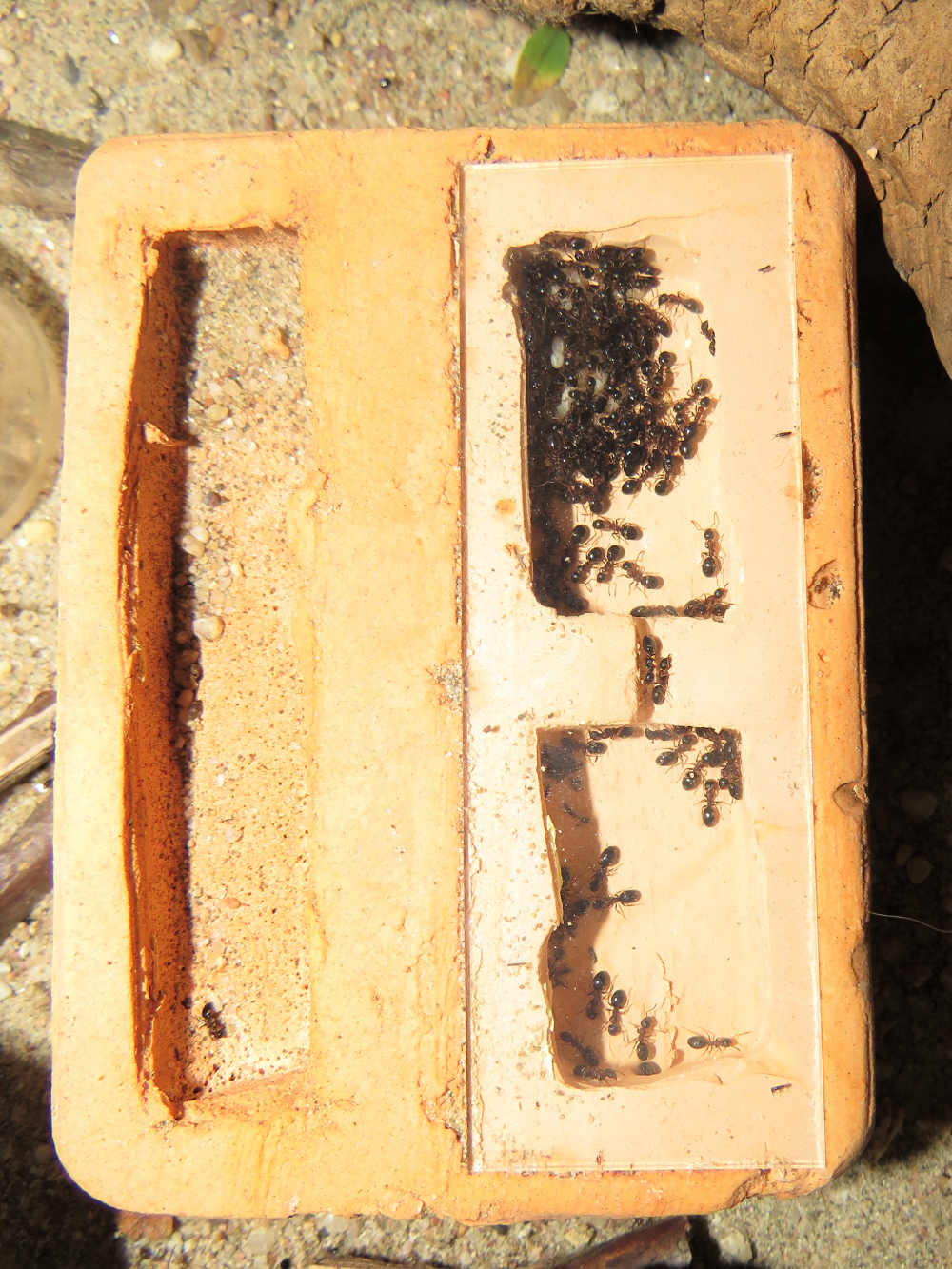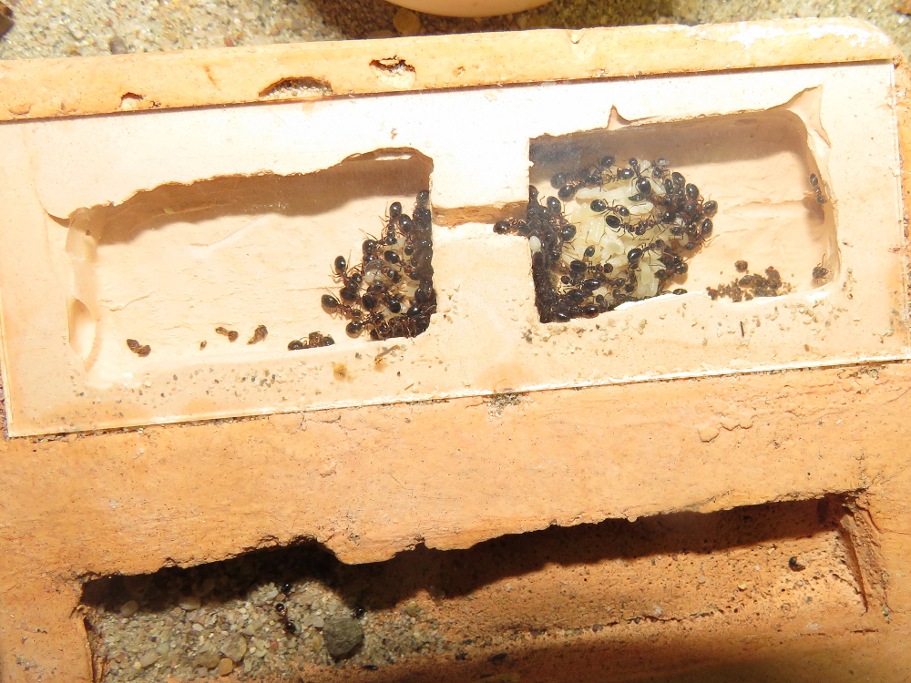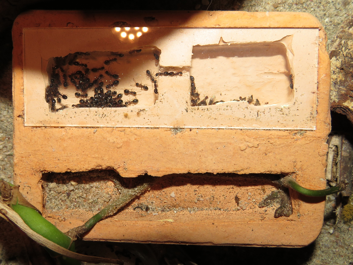 Da soll mal einer schlau draus werden! Nach dem vor drei Tagen die ganze Kolonie vollständig ins Aussennest aus Holz gezogen ist, sind jetzt alle Ameisen wieder ins Hauptnest zurück gekehrt... Nesttreue kann man der Art nicht vorwerfen. Die Ameisen ziehen viel und scheinbar gerne um, wenn die Bedingungen irgendwo besser passen.