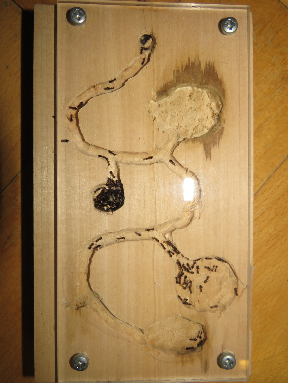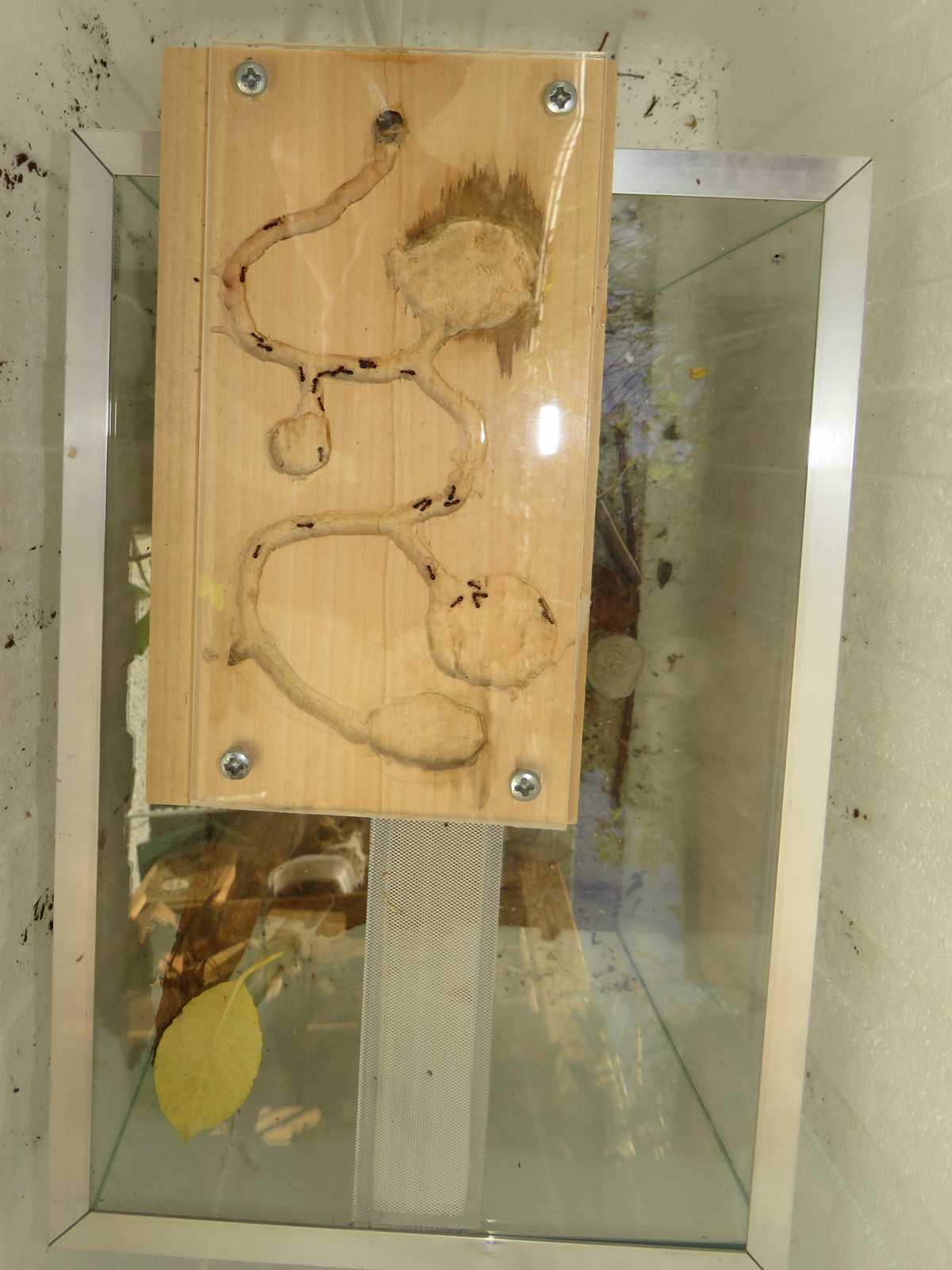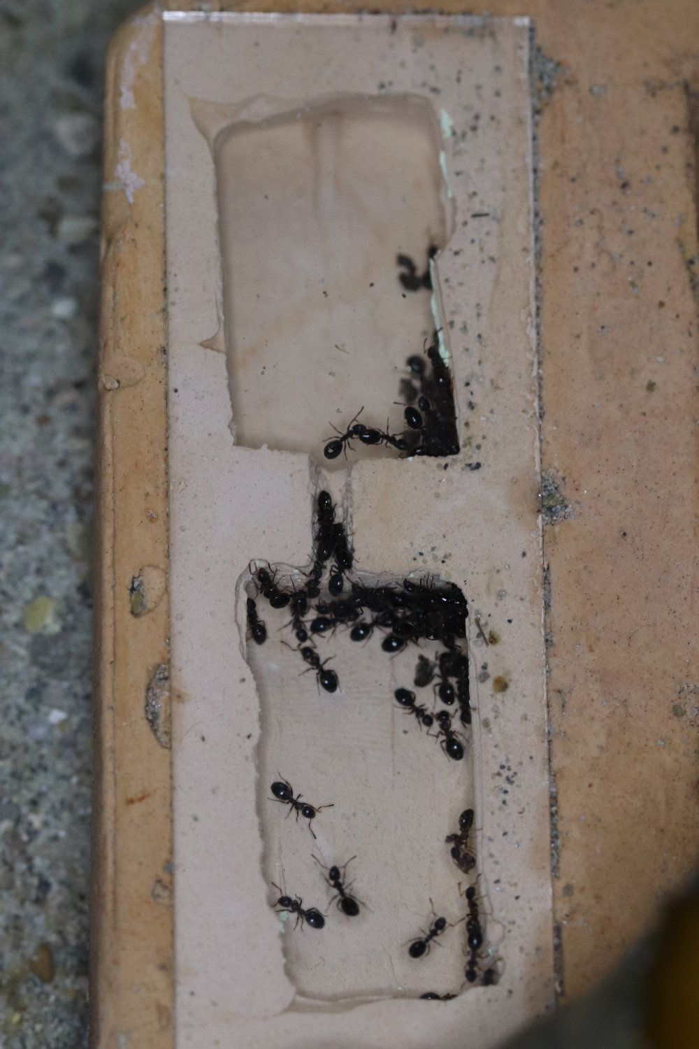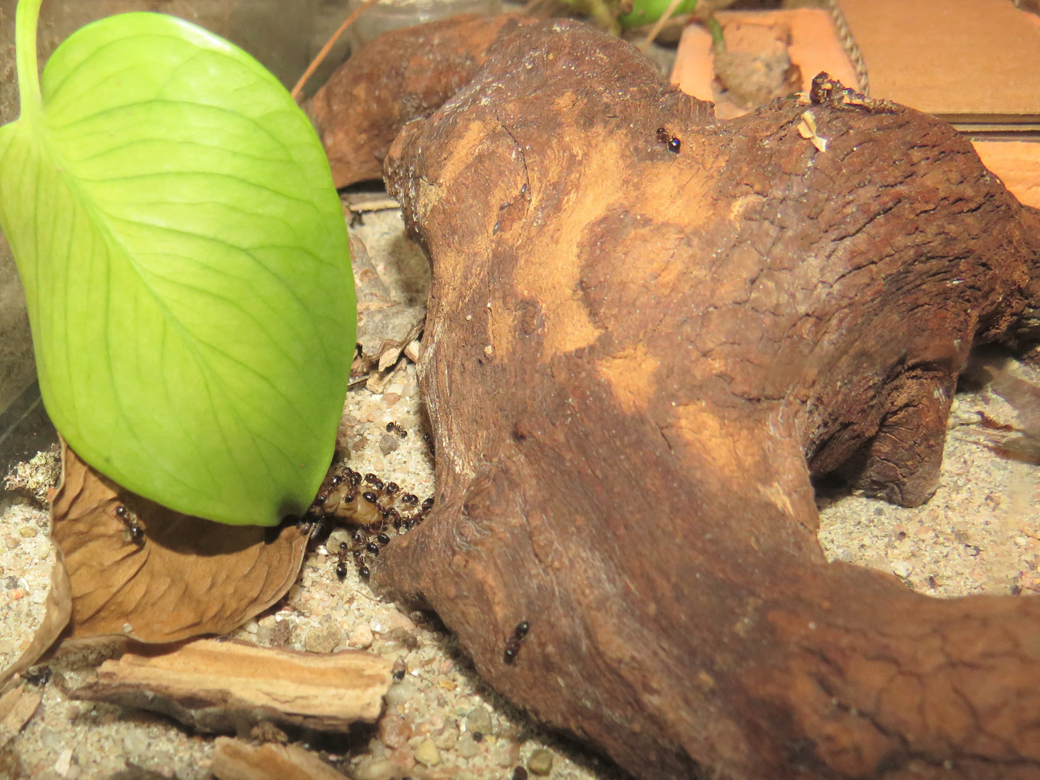 Da soll mal einer schlau draus werden! Nach dem vor drei Tagen die ganze Kolonie vollständig ins Aussennest aus Holz gezogen ist, sind jetzt alle Ameisen wieder ins Hauptnest zurück gekehrt... Nesttreue kann man der Art nicht vorwerfen. Die Ameisen ziehen viel und scheinbar gerne um, wenn die Bedingungen irgendwo besser passen.