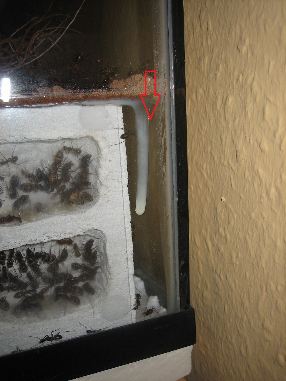 Frisches Trinkwasser wird alle ein bis zwei Wochen im Spender angeboten, der zusätzlich mit Watte gesichert ist, damit die Ameisen nicht ertrinken. Die Ameisen nutzen den Spender regelmäßig, daher ist frisches Wasser absolut Pflicht!