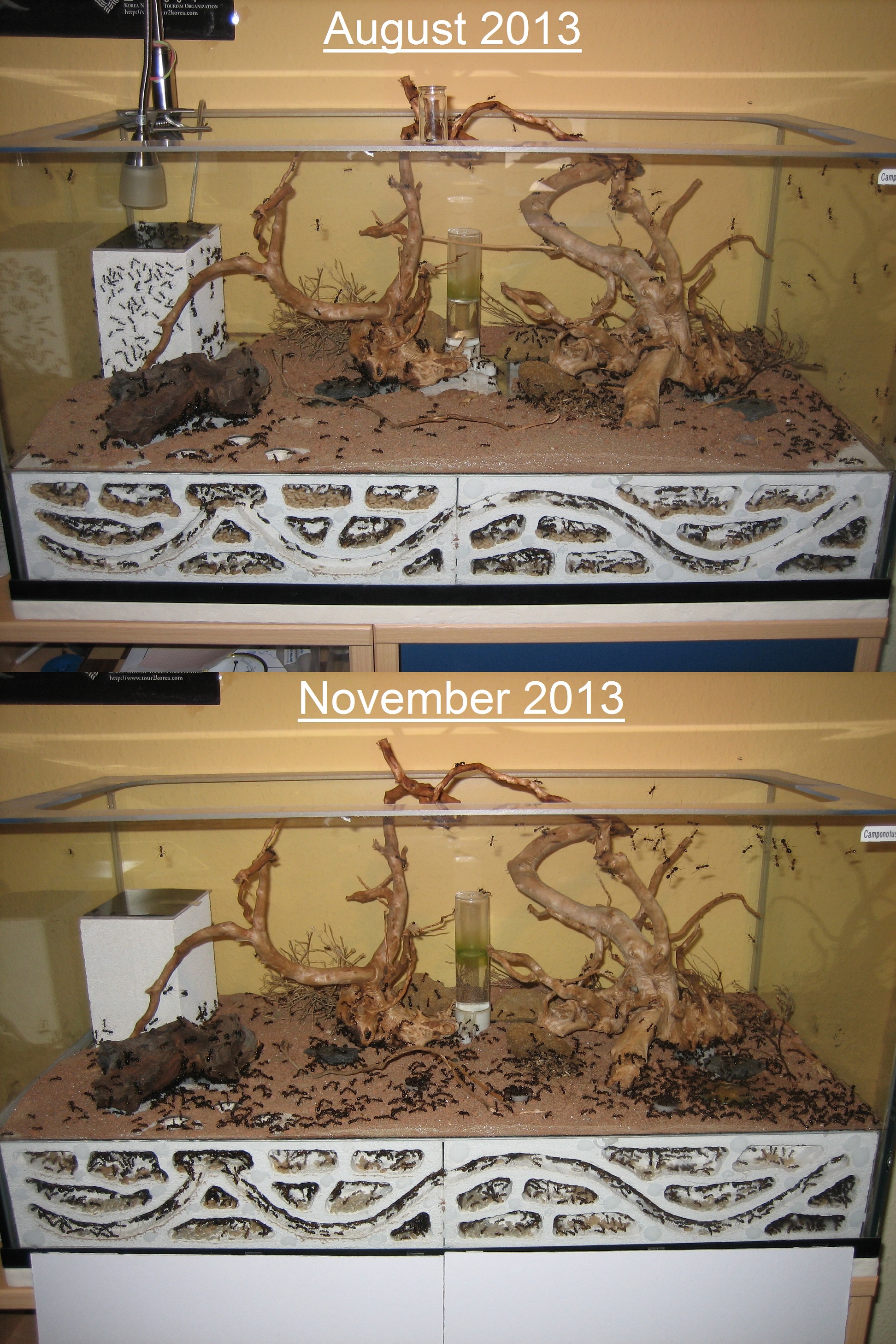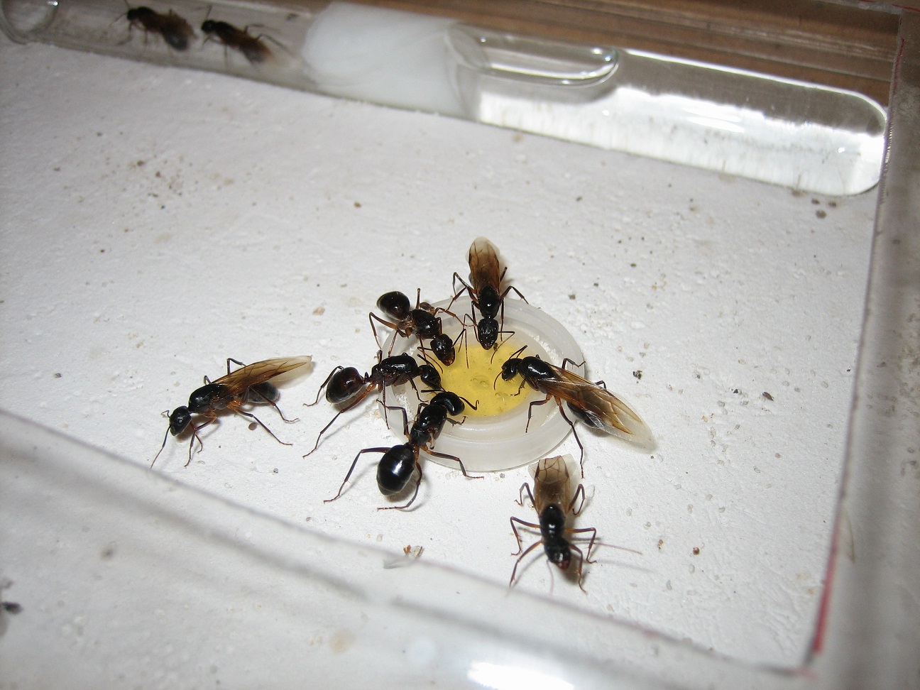 Die Haupt Kohlenhydratquelle stellt purer oder verdünnter Honig. Um Abwechslung zu bieten, werden gelegentlich Zuckerwasser und Früchte an sekundären Futterstellen ausgelegt. Mit der Koloniestärke steigt auch die Entfernung der Futterplätze zum Nest (so weit es das 80er Becken zulässt...). Auch die Wurzeln werden dafür eingebunden, damit die Ameisen etwas zu erkunden haben.