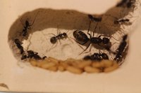 seit langer Zeit heute mal wieder ein Update. Den Ameisen geht es prächtig, aber der Reihe nach. Kurz nach dem letzten Update musste ich mit erstaunen feststellen, dass die Kolonie bereits aus dem Nest heraus gewachsen war und auch die ersten Mayore waren geschlüpft. Das verblüffende bei dieser Art ist, dass es keine Medias gibt. Es gibt nur die großen Mayore und Minore die mittlerweile größer sind als zu Beginn, aber dazwischen gibt es keine anderen Formen. Sie nahmen zu dieser Zeit unglaublich viel Futter an und zogen extrem viel Brut auf, sodass es bald an die 300 Tiere waren.