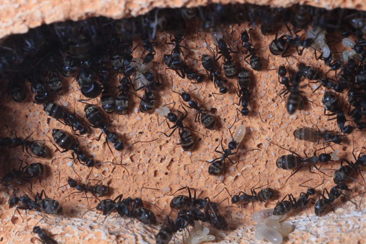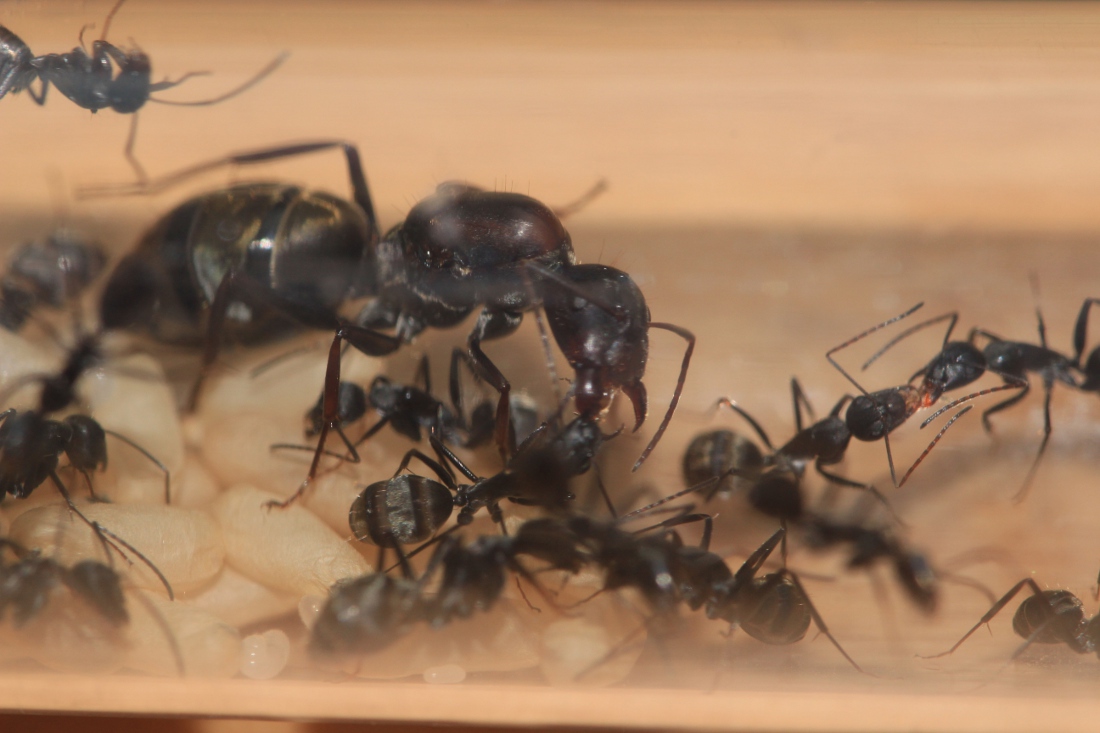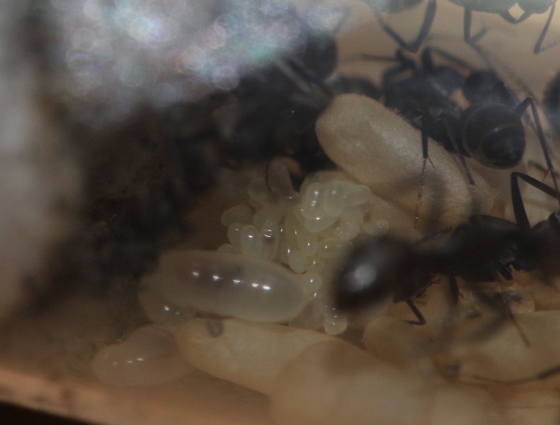 Am 3. Juni habe ich die kleine Kolonie abgeholt. Zu diesem Zeitpunkt waren es eine gesunde, wunderschöne Gyne und 4 Arbeiterinnen. Zudem noch 4 Larven, das wars. Nun ja, seit dem sind diese Larven zu vier neuen Arbeiterinnen geworden und es wurden viele weitere Eier gelegt. Ich schätze sie auf auf etwa 20 Eier und 5 kleine Larven.