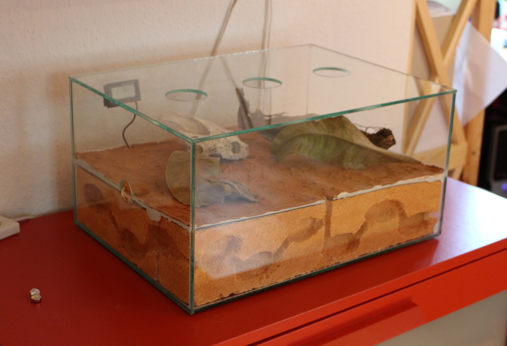 Die Miniarena wird von einer Heizmatte beheizt sodas etwa um die 26°C tagsüber und 23°C Nachts herschen. Was ihnen bis jetzt auch sehr gefällt. Manchmal wenn die Sonne in das Becken scheint lagern sie ihre paar Puppen draußen, dann kann man den schönen Glanz auf dem Gaster sehen.