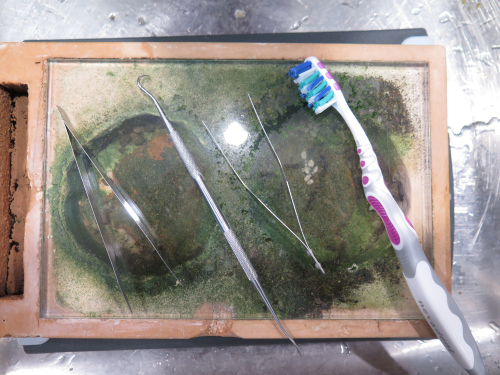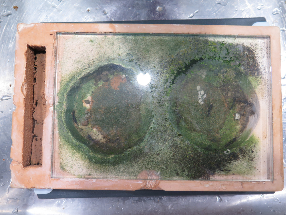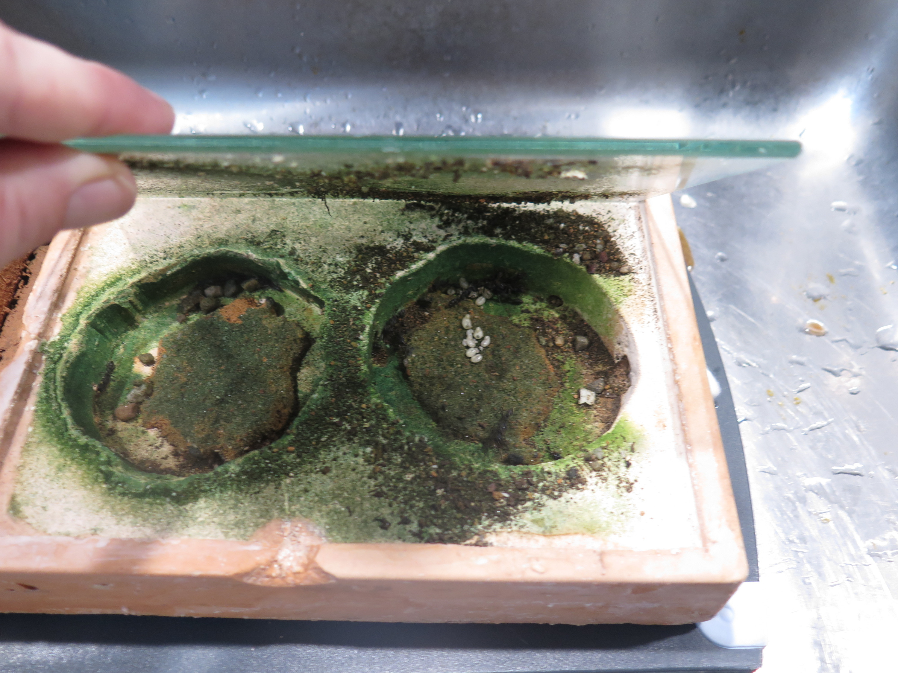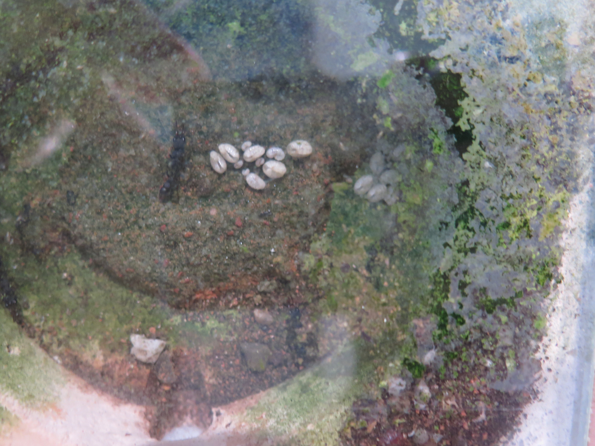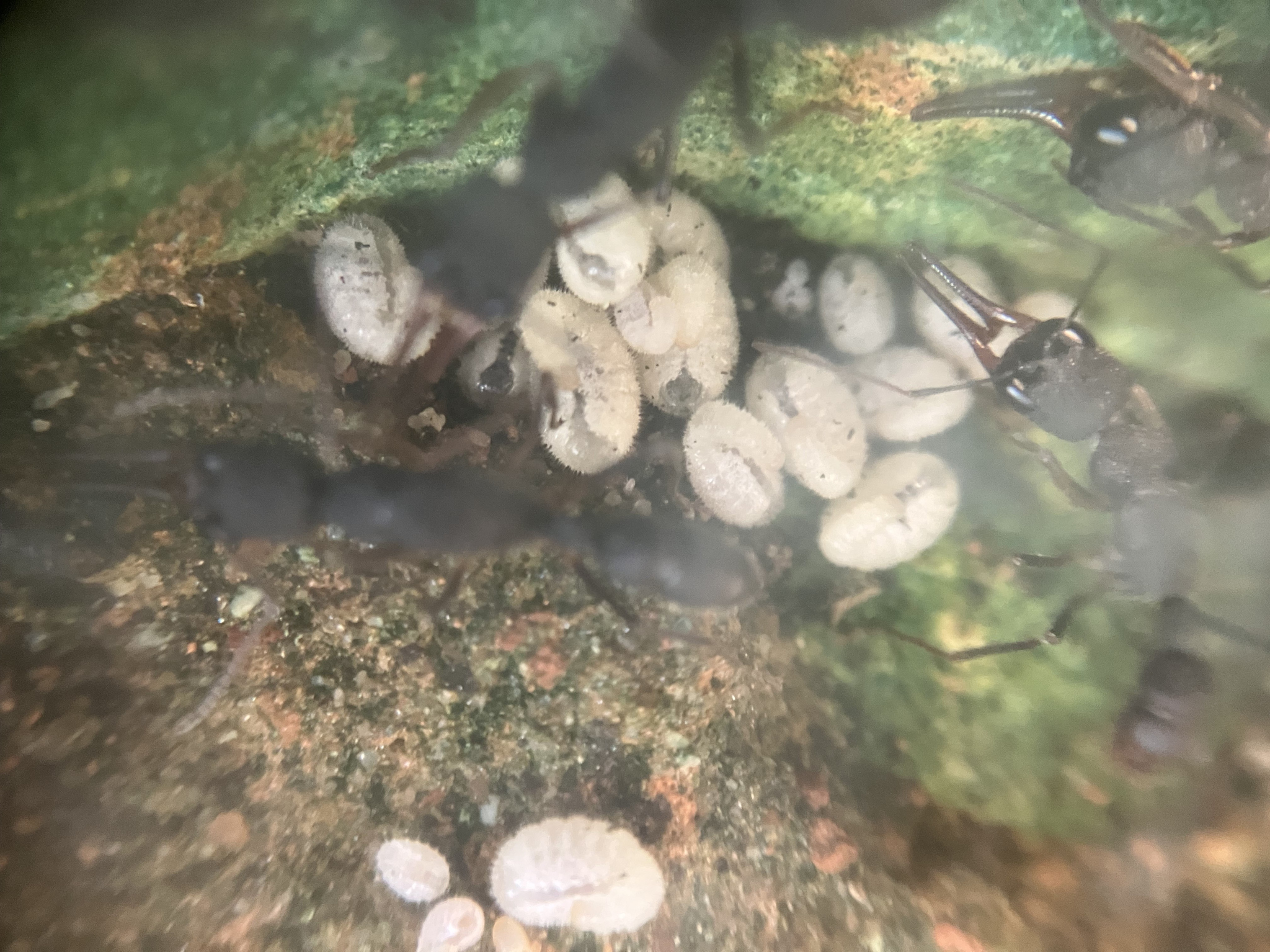 Ich halte meine Harpegnathos venator in einem Gipsnest, welches dauerhaft feucht gehalten wird, so dass mit der Zeit darin Algen gewachsen sind. Der Boden der Kammern habe ich mit einer ca. 5mm hohen Sand-Lehm Mischung befüllt. Da ist sehr wichtig, weil die Larven vor dem Verpuppen von den Arbeiterinnen immer gänzlich mit Erde zugedeckt werden.