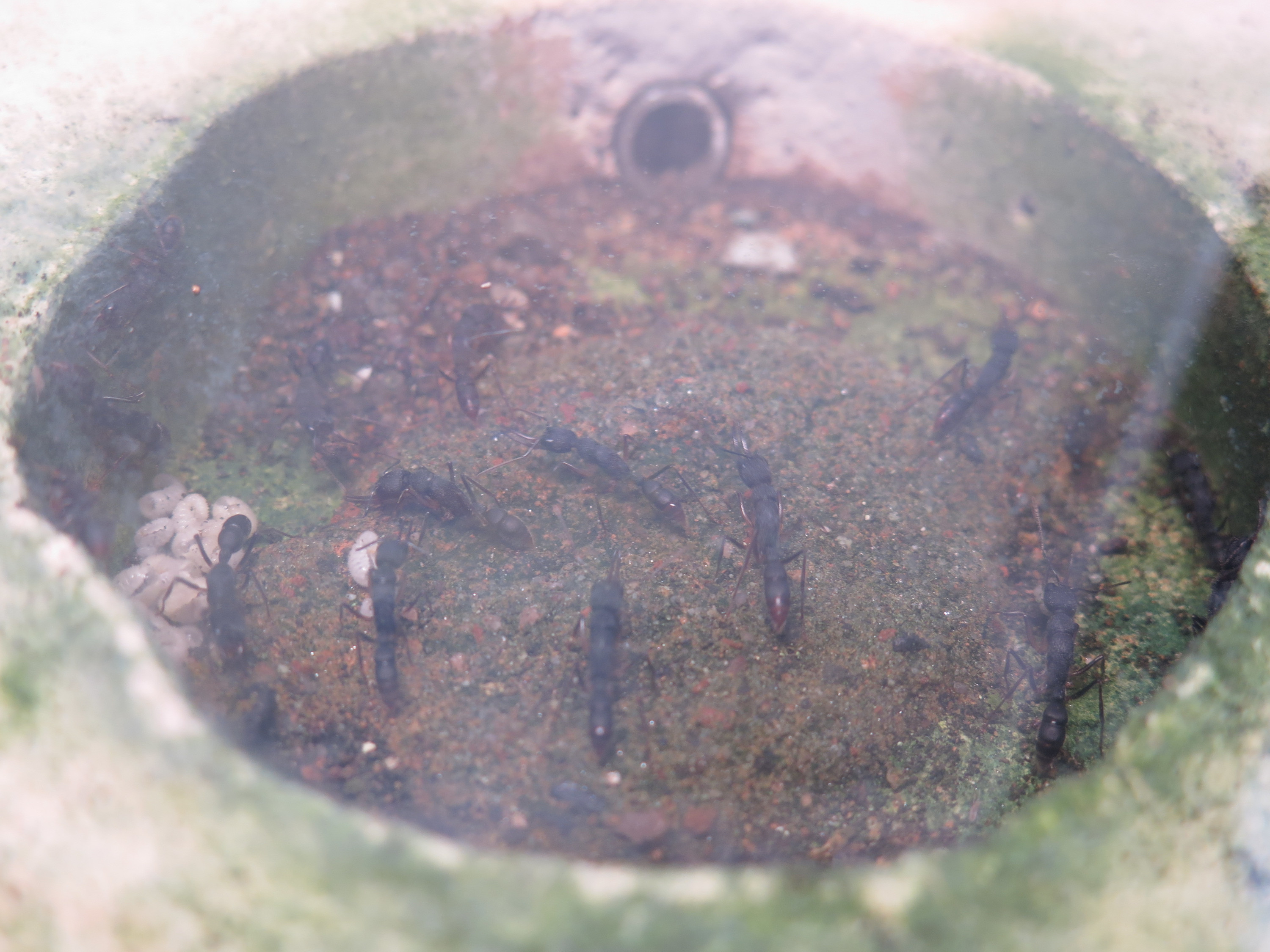 Der Bodengrund besteht aus Kies, um zu verhindern, dass die Tiere in die Arena ziehen. Die Oberfläche des Kieses ist trocken und mit einigen Blättern und Streu bedeckt, aber im Kies steht Wasser. Dieses versorgt die Pflanzen - eine robuste Efeutute und einige Moose - mit Wasser und sorgt für eine hohe Luftfeuchtigkeit im Becken von 70 – 85 %. Dazu kommt eine Wurzel die Kletter- und Versteckmöglichkeiten bietet. Sowohl im Nest wie auch in der Arena befinden sich Springschwänze, die Futterreste beseitigen und von den Ameisen geduldet bzw. ignoriert werden. Es fouragierenden immer nur sehr wenige Arbeiterinnen im Becken und steht einzeln für sich. Aber sie sind sehr flink. Wenige Minuten nach der Zugabe von Futtertieren, werden diese schon ins Nest eingetragen. Im Nest fressen sowohl die Larven mit ihren langen, beweglichen Hälsen an den Futtertieren als auch die adulten Tiere. Verstorbene Arbeiterinnen werden von ihren Nestgenossinnen lange in der Arena umhergetragen. Oft werde ich so darauf aufmerksam und kann sie ihrer letzten Begleiterin abnehmen.