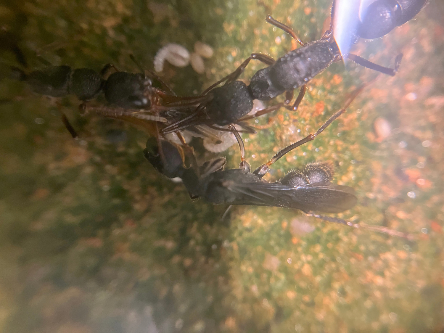 Ich halte meine Harpegnathos venator in einem Gipsnest, welches dauerhaft feucht gehalten wird, so dass mit der Zeit darin Algen gewachsen sind. Der Boden der Kammern habe ich mit einer ca. 5mm hohen Sand-Lehm Mischung befüllt. Da ist sehr wichtig, weil die Larven vor dem Verpuppen von den Arbeiterinnen immer gänzlich mit Erde zugedeckt werden.