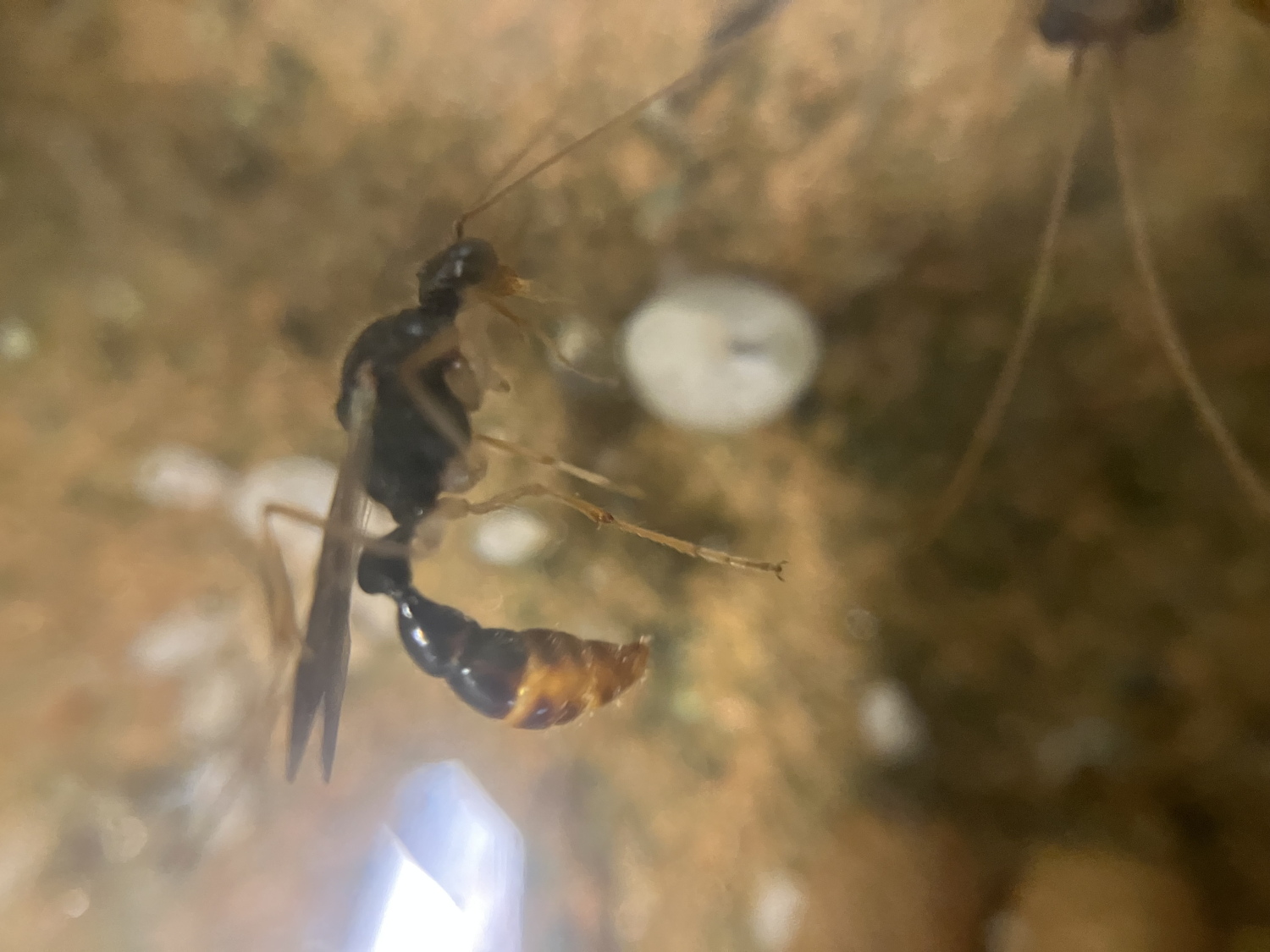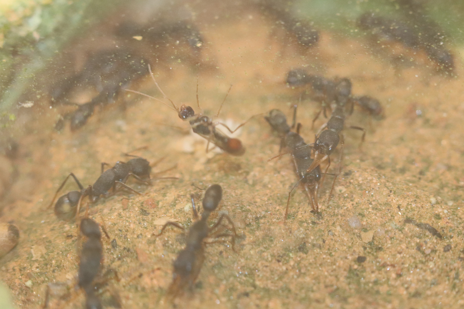 Verschärfend kam hinzu, dass ich bei der letzten Reinigung die Glasscheibe nicht ganz korrekt aufgesetzt habe, es blieb teilweise eine kleine Lücke. Dies führte dazu, dass die Ameisen die Hohlräume mit Erde und Lehm auffüllten, und die Scheibe erst recht mit Erde und anderen Partikeln zuzudecken begannen. Ausserdem verschliessen die Ameisen regelmässig den Nesteingang komplett mit Erde, Lehm und Steinchen. Die Gründe sind mir nicht ganz klar, möglicherweise lösen gewisse Veränderungen der Parameter dieses Verhalten aus. Evtl. erwarten die Ameisen eine Regenzeit? Jedenfalls stellen sie die Aussenaktivitäten dann ein. Wenn sie über längere Zeit keine Nahrung mehr eingetragen und viele Larven vorhanden sind, entferne ich diese Verbauungen aus dem Schlauch. Danach beginnen einzelne Arbeiterinnen normalerweise zeitnah wieder, die Arena aufzusuchen und zu jagen.