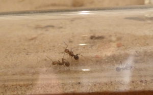 Während frische Zophobas-Würmer von den Messor minor hesperius angenommen wurden, ließen sie diese im aufgetauten Zustand fast immer links liegen. Daher kaufte ich mir bei einem Reptilienbedarf-Versandhaus ein paar Packungen Heimchen in verschiedenen Größen. Hier zeigten sich die Messor sowohl von den frischen, als auch von den aufgetauten Heimchen schwer begeistert. Gemeinschaftlich wurden die Gliedmaßen abgetrennt und zum Nest gebracht und dann das Heimchen schließlich ausgehöhlt. Da jetzt im Frühjahr und Sommer sich auch weitere Insekten in meine Wohnung verirren werden, bin ich mal gespannt, was meine Ameisen sonst so gerne fressen.