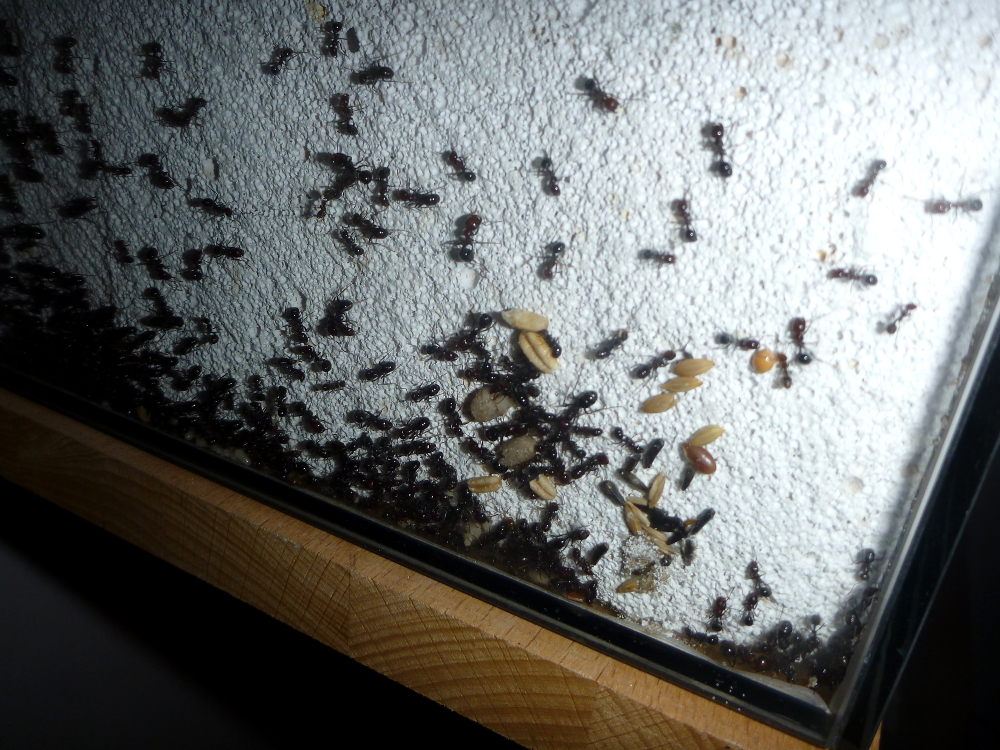 Ich hatte mich sehr auf das Beobachten des Umzuges gefreut, aber Ameisen machen sowieso nur das, was sie wollen und vor ein paar Tagen schaute ich morgens ins Reagenzglasnest und sah, dass die Gyne nicht mehr da war. Ein Blick ins Ytong-Nest schaffte Klarheit: fast alle Arbeiterinnen, samt Brut und verbliebenden Körnern, waren in das Ytong-Nest gezogen. Jetzt kann ich sie sehr viel besser beobachten und es freut mich, dass den Ameisen mein selbstgebautes Nest scheinbar behagt.