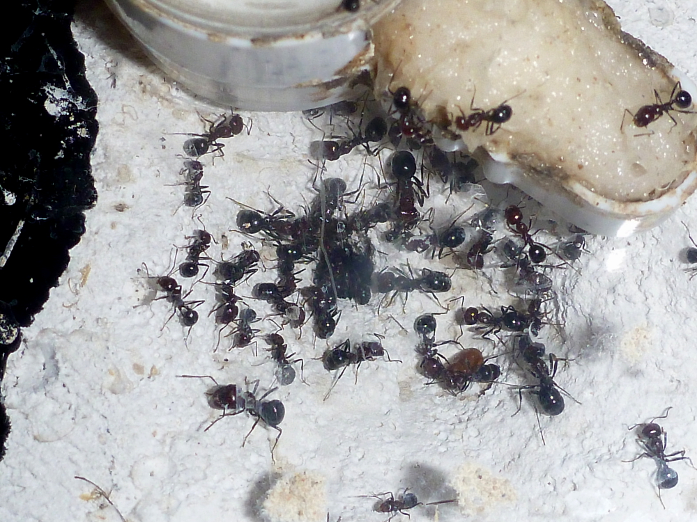 Am Anfang der Haltung habe ich immer von allem Futter reichlich angeboten, das sorgte dafür, dass immer wieder einzelne Arbeiterinnen am Futter waren. Mittlerweile entferne ich Futterreste am zweiten Tag und füttere einen Tag nicht. Am nächsten Tag bilden sich schon fast kleine Ameisenstraßen und das Futter wird begeistert angenommen. Ich vermute mal, dass ein Tag fasten den Ameisen nicht schadet (zumal sie immer einen mehr als prall gefüllten Kornspeicher haben) und für die Beobachtung der Ameisen lohnt sich das total. Gerade wenn Besuch kommt, ist das eine gute Möglichkeit die Faszination der Ameisenhaltung anschaulich zu machen.