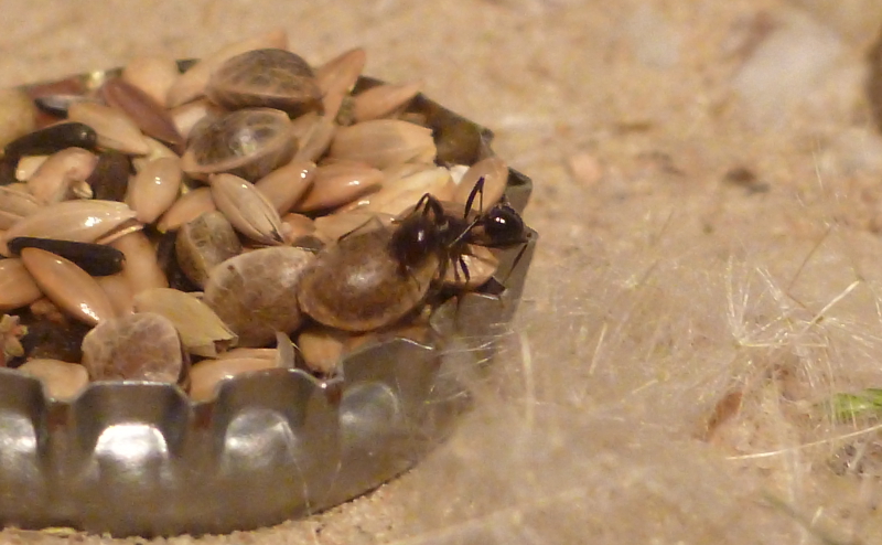 Am Anfang habe ich den Ameisen Körner aus einer Körnermixtur vom Antstore angeboten und diese wurde auch gerne angenommen. Vor allem die kleinen, schwarzen Körner schienen den Ameisen zu gefallen. Vor ein paar Tagen habe ich am Wegesrand eine Pusteblume, also die Samen vom Löwenzahn, eingesammelt und diese meinen Messor angeboten. Ich stellte dabei fest, dass meine Messor Löwenzahnsamen über alles lieben. Kaum werden sie entdeckt, stürmen mehrere Arbeiterinnen aller Unterkasten hin und fangen an, diesen einzutragen.