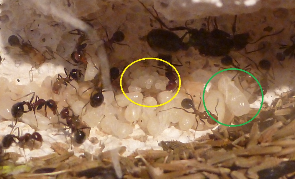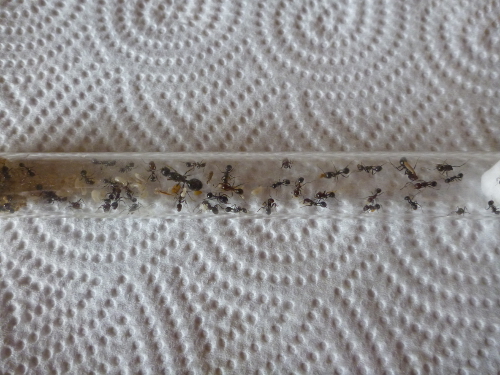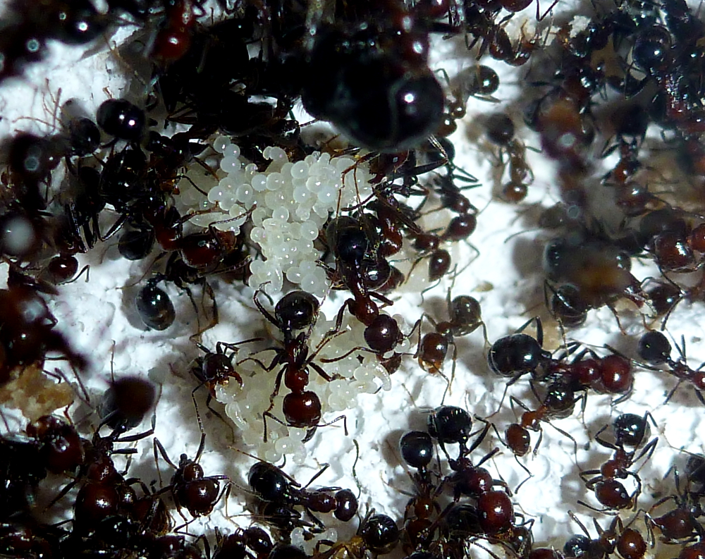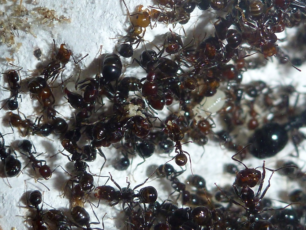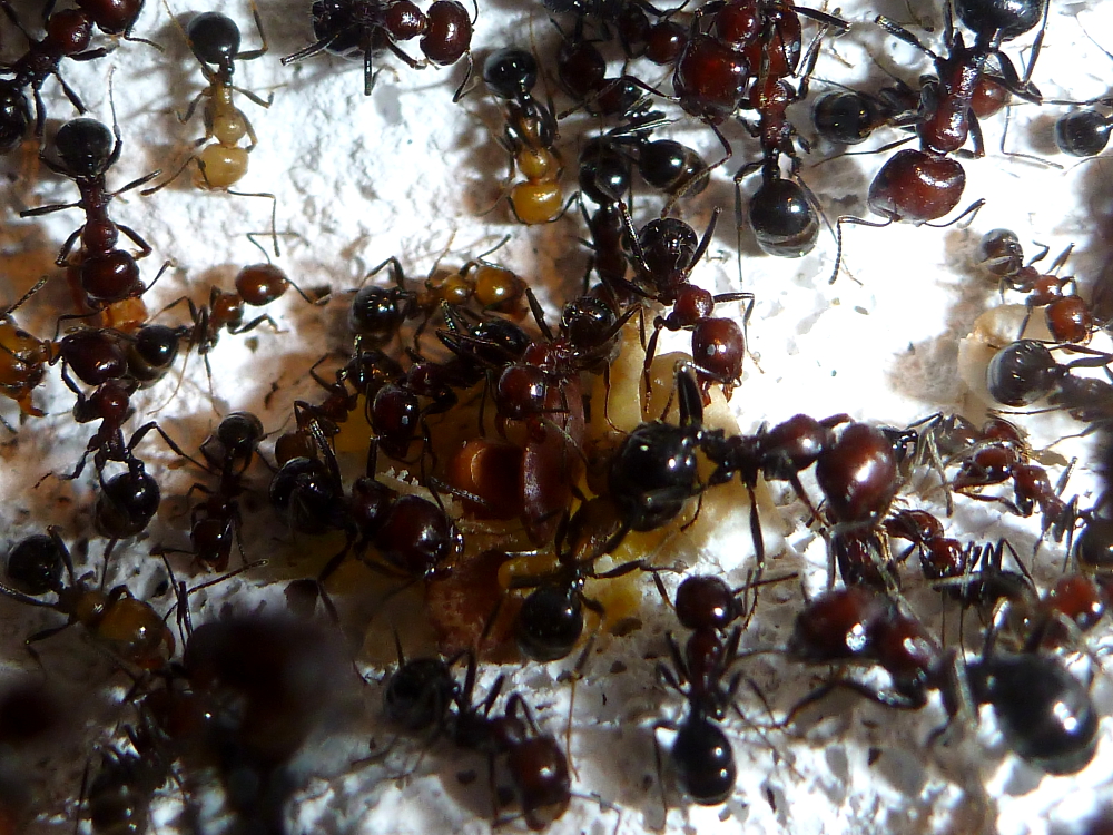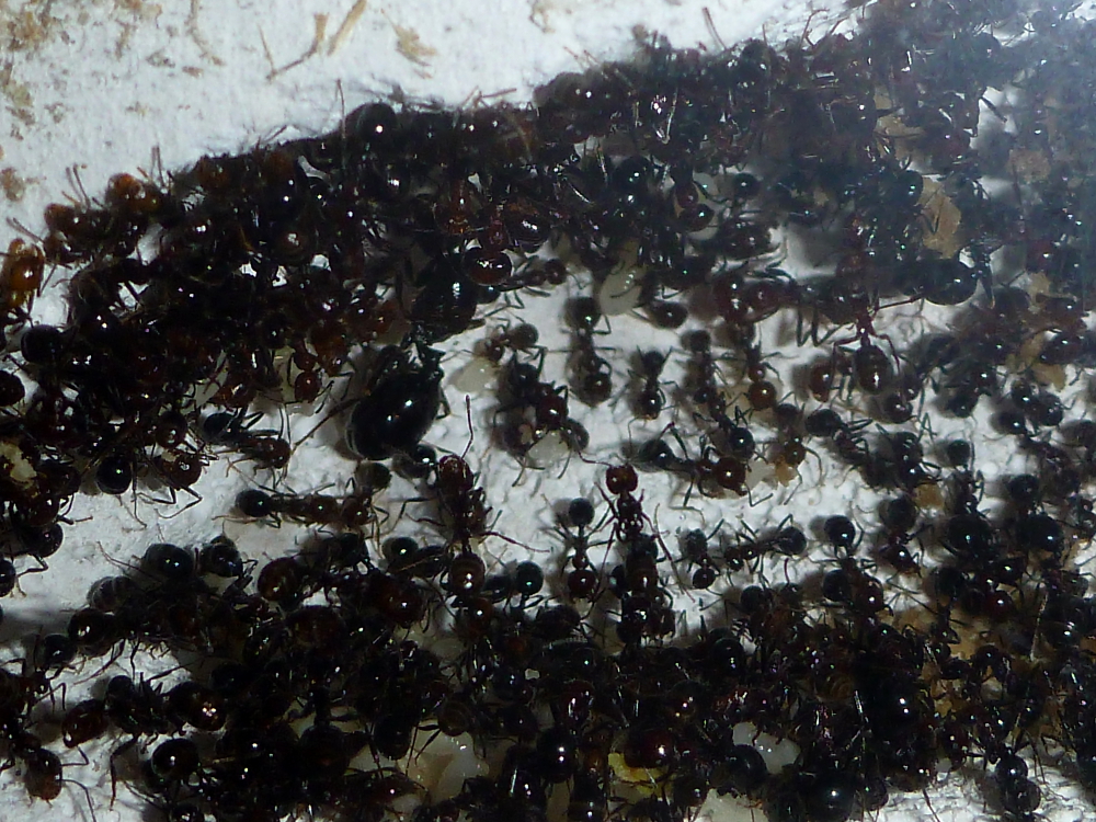 Durch die hohe Sterberate war meine Kolonie auf eine Größe von unter 30 Arbeiterinnen geschrumpft, mittlerweile dürften es aber wieder um die sechzig sein und es ist immernoch reichlich Brut vorhanden.
