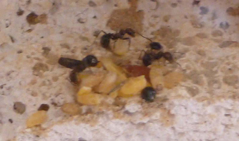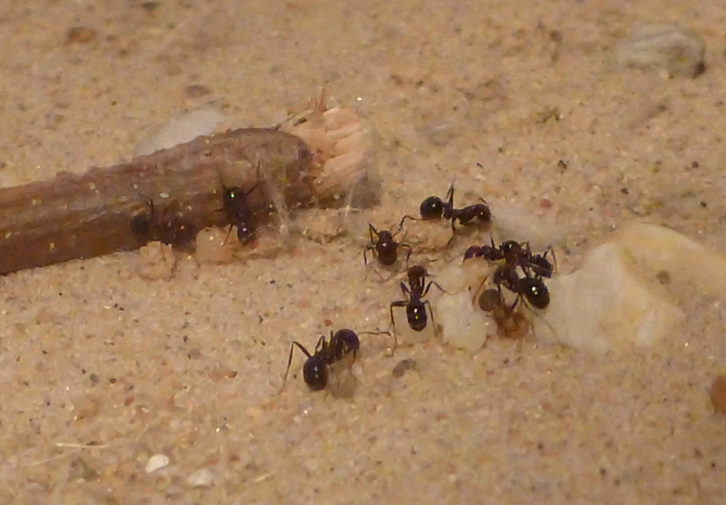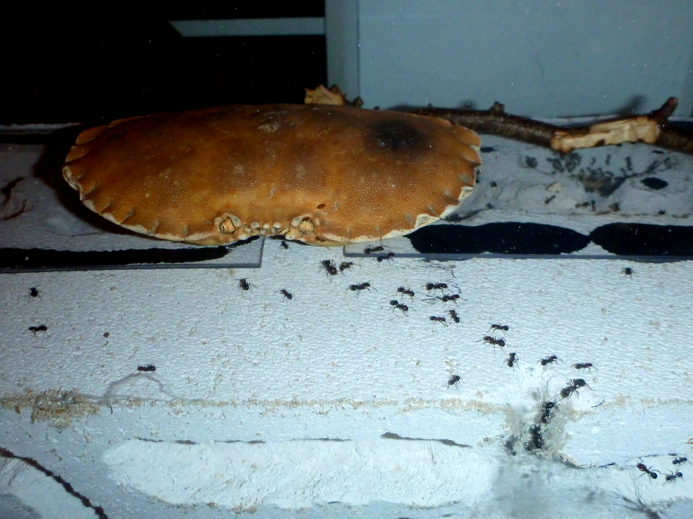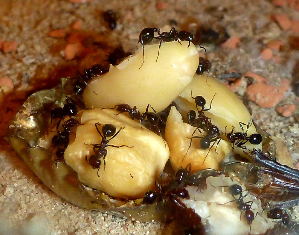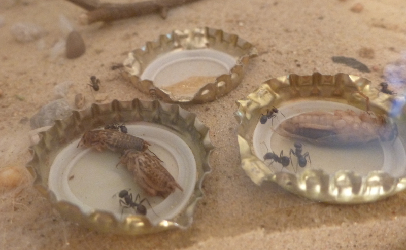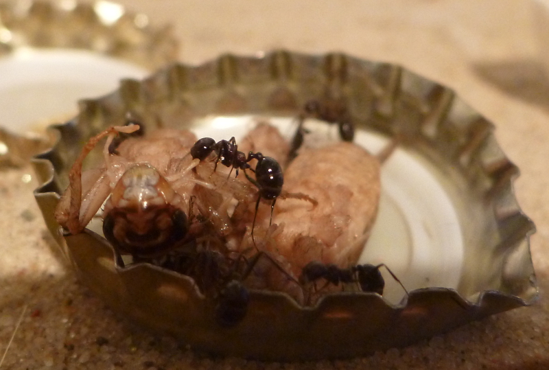 Während frische Zophobas-Würmer von den Messor minor hesperius angenommen wurden, ließen sie diese im aufgetauten Zustand fast immer links liegen. Daher kaufte ich mir bei einem Reptilienbedarf-Versandhaus ein paar Packungen Heimchen in verschiedenen Größen. Hier zeigten sich die Messor sowohl von den frischen, als auch von den aufgetauten Heimchen schwer begeistert. Gemeinschaftlich wurden die Gliedmaßen abgetrennt und zum Nest gebracht und dann das Heimchen schließlich ausgehöhlt. Da jetzt im Frühjahr und Sommer sich auch weitere Insekten in meine Wohnung verirren werden, bin ich mal gespannt, was meine Ameisen sonst so gerne fressen.