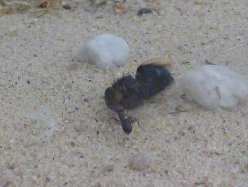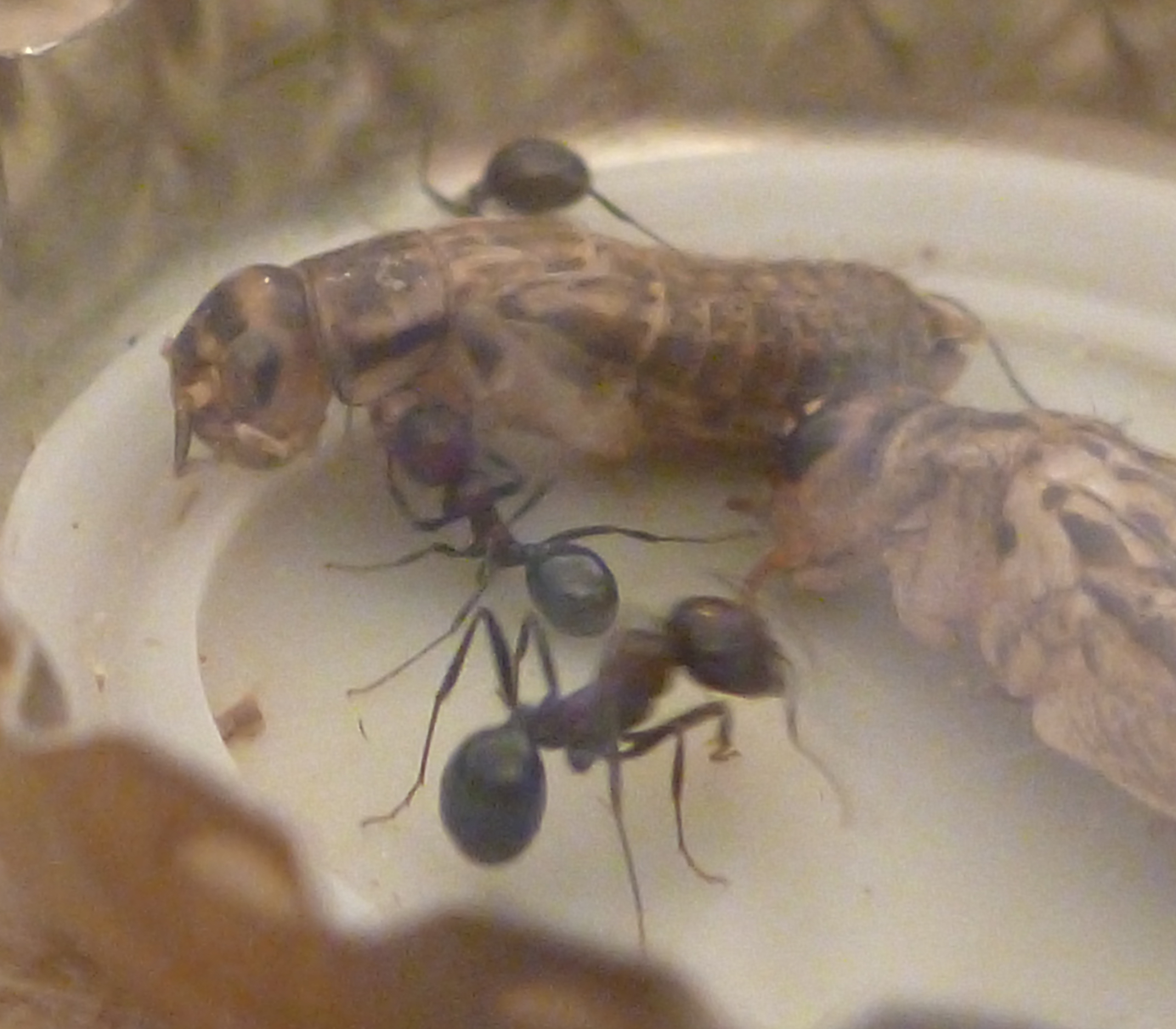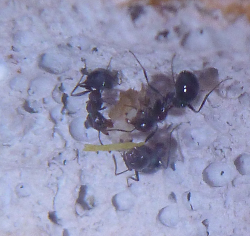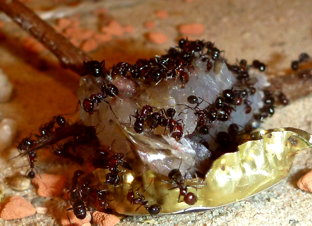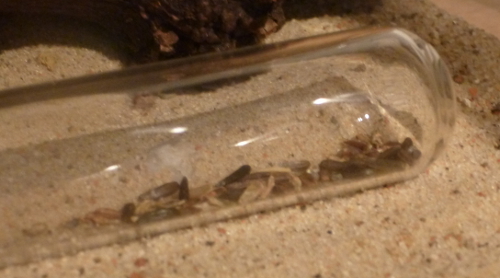 Während frische Zophobas-Würmer von den Messor minor hesperius angenommen wurden, ließen sie diese im aufgetauten Zustand fast immer links liegen. Daher kaufte ich mir bei einem Reptilienbedarf-Versandhaus ein paar Packungen Heimchen in verschiedenen Größen. Hier zeigten sich die Messor sowohl von den frischen, als auch von den aufgetauten Heimchen schwer begeistert. Gemeinschaftlich wurden die Gliedmaßen abgetrennt und zum Nest gebracht und dann das Heimchen schließlich ausgehöhlt. Da jetzt im Frühjahr und Sommer sich auch weitere Insekten in meine Wohnung verirren werden, bin ich mal gespannt, was meine Ameisen sonst so gerne fressen.