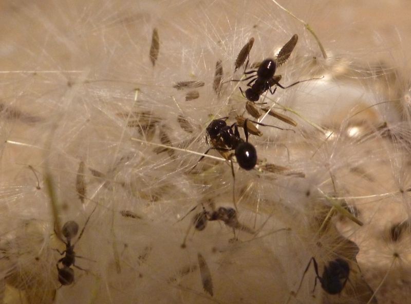 Am Anfang habe ich den Ameisen Körner aus einer Körnermixtur vom Antstore angeboten und diese wurde auch gerne angenommen. Vor allem die kleinen, schwarzen Körner schienen den Ameisen zu gefallen. Vor ein paar Tagen habe ich am Wegesrand eine Pusteblume, also die Samen vom Löwenzahn, eingesammelt und diese meinen Messor angeboten. Ich stellte dabei fest, dass meine Messor Löwenzahnsamen über alles lieben. Kaum werden sie entdeckt, stürmen mehrere Arbeiterinnen aller Unterkasten hin und fangen an, diesen einzutragen.
