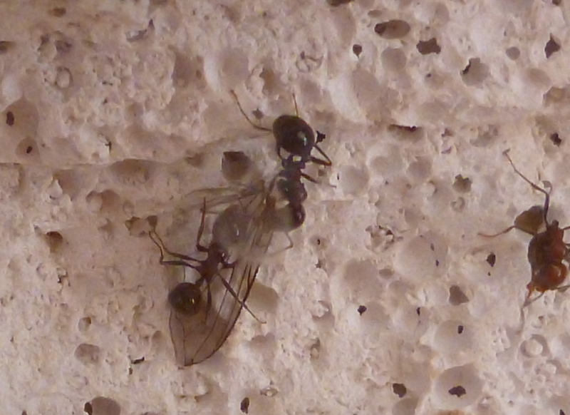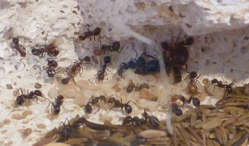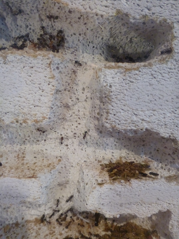Ich hatte mich sehr auf das Beobachten des Umzuges gefreut, aber Ameisen machen sowieso nur das, was sie wollen und vor ein paar Tagen schaute ich morgens ins Reagenzglasnest und sah, dass die Gyne nicht mehr da war. Ein Blick ins Ytong-Nest schaffte Klarheit: fast alle Arbeiterinnen, samt Brut und verbliebenden Körnern, waren in das Ytong-Nest gezogen. Jetzt kann ich sie sehr viel besser beobachten und es freut mich, dass den Ameisen mein selbstgebautes Nest scheinbar behagt.