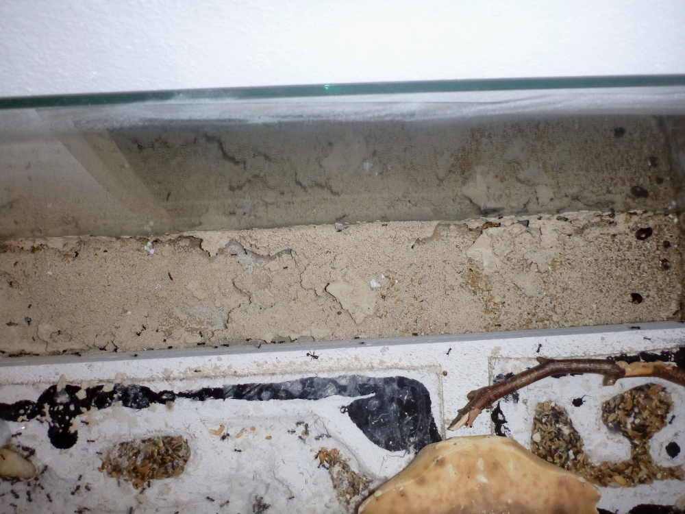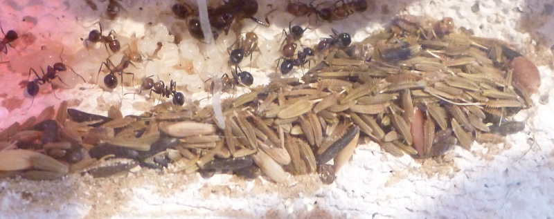 In dem angebotenen Ytong-Nest befanden sich immer wieder ein paar Arbeiterinnen, manchmal etwas Brut und viele Körner, das Reagenzglas, was die alte Kornkammer dargestellt hatte, wurde nicht mehr genutzt und langsam ausgeräumt, stattdessen befanden sich die Körner in der untersten Kammer des Ytong-Nestes.