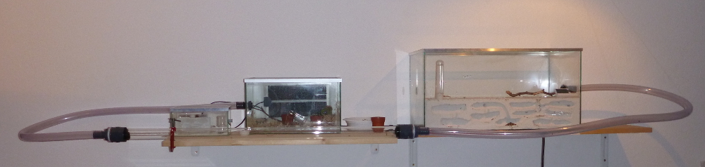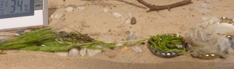 Obwohl diese Bedingungen eigentlich dem natürlichen Habitat der Messor minor hesperius (nur Makaronesien) zu der Jahreszeit entsprechen sollten, starben immer wieder Arbeiterinnen und die zahlreichen Puppen schlüpften nicht. Nachdem ich viel ausprobiert hatte, habe ich aus Verzweiflung eine weitere Heizmatte - diesmal größer und stärker - unter dem Formicarium angebracht und auch das Ytong-Nest wurde durch eine kleine Heizmatte erwärmt. Die Haltungsparamter haben sich dadurch drastisch geändert. Während die Temperatur jetzt zwischen 22°C und 35°C schwankt (die neue Heizmatte heizt nur mittags) und meistens zwischen 25°C und 30°C liegt, ist die Luftfeuchtigkeit auf 20-50% gesunken.