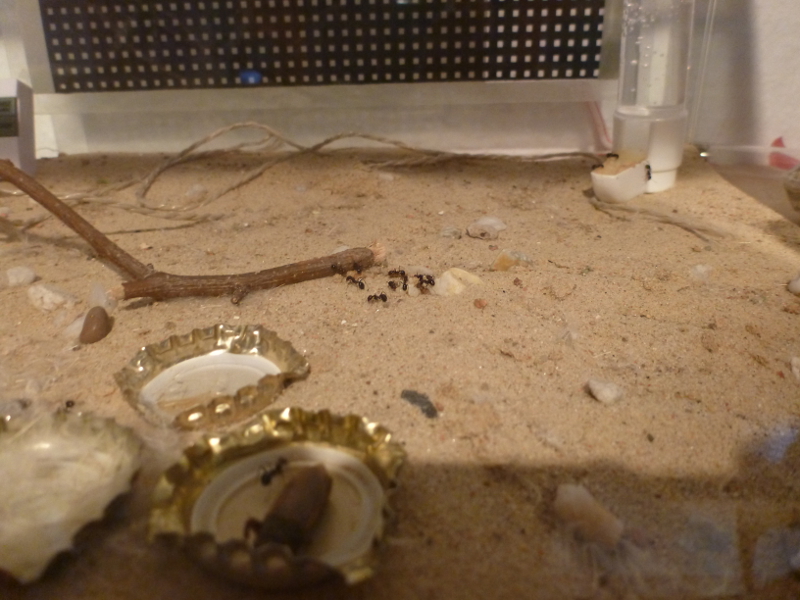 Die Ameisen kamen in ein Formicarium mit Sanduntergrund, es wurden Körner, Zophobas-Würmer und Honig angeboten. Dazu gab es eine Tränke. Beheizt wurde das Formicarium durch eine Heizmatte an der Rückseite und es herrschten meistens um die 20-25°C bei einer Luftfeuchtigkeit von etwa 50-70%.