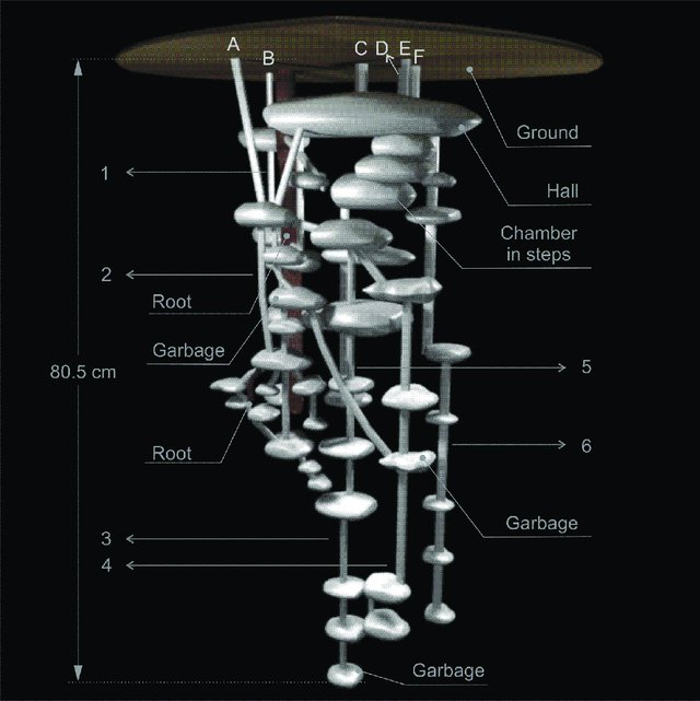 Fig 2. Scheme of Nest 2 of Odontomachus chelifer. A to F = entrance orifices of the nest. 1 to 6 = Shafts of the nest. Maximum depth indicated on the major shaft. / Nest Nr. 2 schematisch: A bis F = Nesteingänge; 1 bis 6: Schächte des Nests; die maximale Tiefe ist für den größten Schacht angegeben. https://doi.org/10.1371/journal.pone.0189896.g002