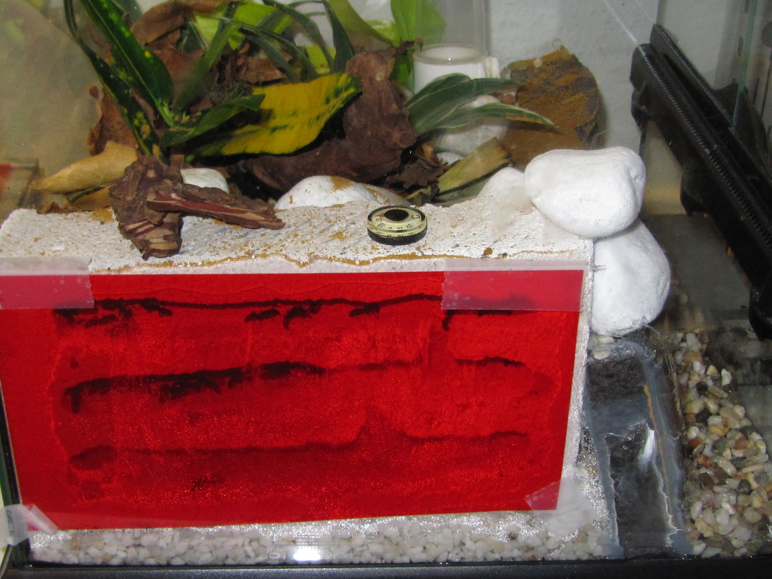 Da sie auf die Heizmatte am Nest mit Flucht reagiert haben und ich die Matte anderweitig nicht mit wirklich gutem Effekt (dicke Kiesschicht) einsetzen kann, habe ich mich für den Einsatz einer Wärmelampe entschieden. Auf der der Pflanzen-Oberfläche erzeugt diese eine Temperatur von 30°C, unter den Blättern ist es bereits etwas kühler. In der Ecke, die am weitesten vom Lichtkegel weg ist, messe ich noch 25°C. In der Nacht wird es im Formicarium 22°C "kalt". Ich hoffe bei den Ameisen mit der Temperaturanstieg „Frühlingsgefühle“ zu wecken.