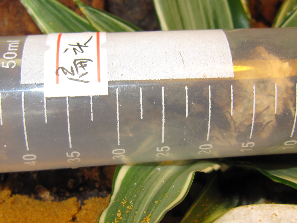 Ansonsten besteht der Bodengrund des Terrariums aus Kies und Sand. Die groben Körner sollen Grabaktivitäten nur bedingt zulassen. Schliesslich soll das Völklein in das an der Scheibe angeklebte Ytongnest einziehen (in der Zwischenzeit geschehen, brav!). Zwischen Bodenglas und Ytong bleiben zwei Zentimeter Kiesschicht, in die ich „Grundwasser“ füllen kann ohne den Ytong direkt zu „ertränken“. Das Grundwasser sorgt zusammen mit der Heizmatte und dem Strahler für tropische Luftfeuchtigkeit und Pflanzenwachstum. Zwischen den Pflanzen gibt es eine kleine Wurzel, einige Steine und getrocknetes Eichenlaub. So sollten sich die Tiere eigentlich wohlfühlen. Zur „Müllabfuhr“ und „Schimmelprävention“ habe ich die Laubschicht mit Springschwänzen „geimpft“.