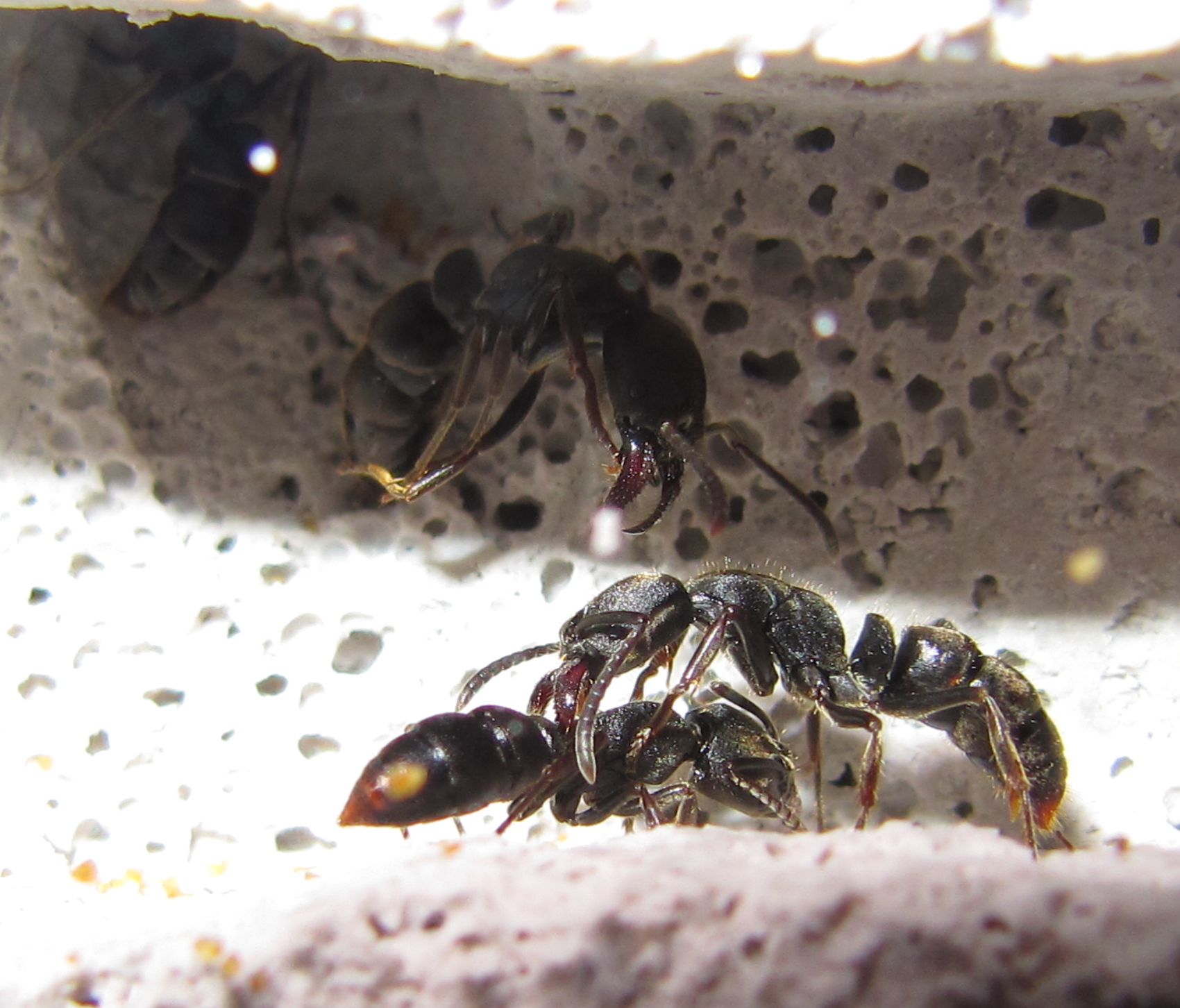 Ectomomyrmex astutus Arbeiterinnen sind ausserhalb des Nestes „Einzelkämpferinnen“. In der Regel streifen sie alleine durchs Terrarium. Die Aussenaktivität scheint tagsüber deutlich höher als in der Nacht. Selten sieht man zwei im Tandemlauf durchs Terrarium rennen: Die hintere Ameise berührt mit den Fühlern den Hinterleib der vorderen und weicht bis zum Ziel nicht von ihrer, naja Gaster. Dabei sind die Ameisen, die sich sonst eher gemächlich bewegenden Ameisen mitunter recht schnell unterwegs. Seltsamerweise konnte ich dieses Verhalten mehrmals beim Rückweg zum Nest beobachten und nicht wie erwartet zu einer Futerquelle hin. Wenn zwei Ameisen langsam im Tandem durchs Terrarium ziehen, wirkt das wenig zielstrebig. So, als wüsste die Vordere auch nicht so genau wo es lang geht...