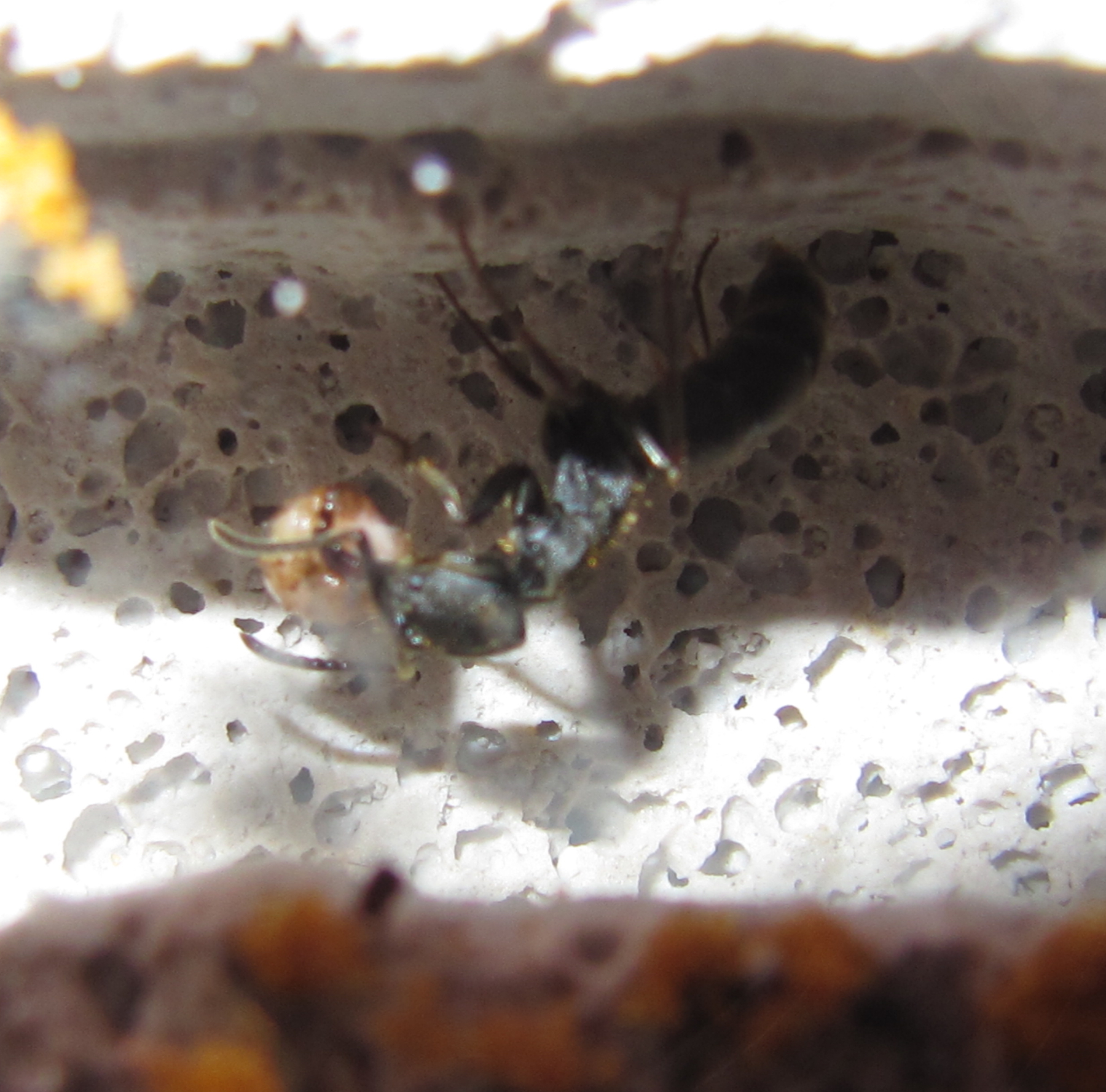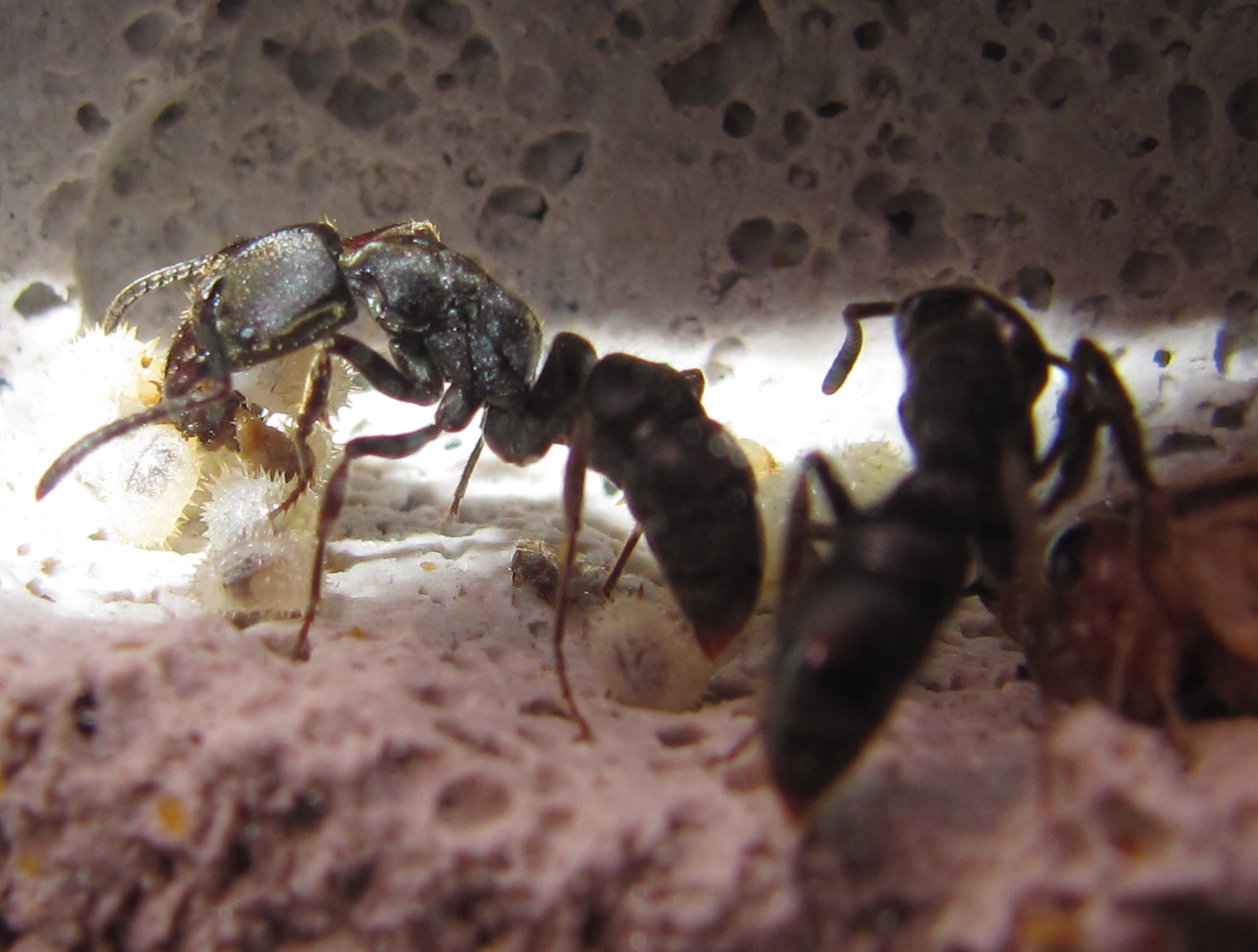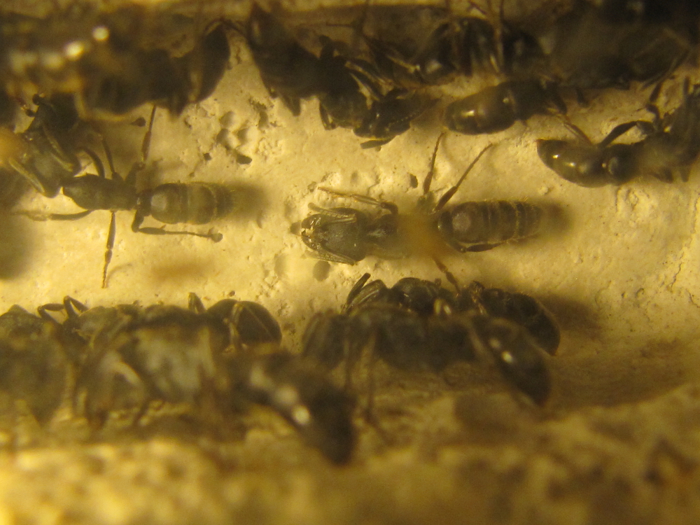 Zu den Zweignestern kann ich sagen, dass die Vicher in der Lage sind, jede kleine Ritze im Kies zu nutzen und teilweise auch auszubauen. Neulich ist mit aufgefallen, dass sie sogar irgendwie unter den Ytong gelangt sind. Dennoch, der Grossteil der Arbeiterinnen hält sich brav im Ytongnest auf. So dass ich mittlerweile der Meinung bin, dass die Puppen zumindest teilweise geschlüpft sind. Seit sie bei mir sind, sind andererseits vier Ameisen gestorben.