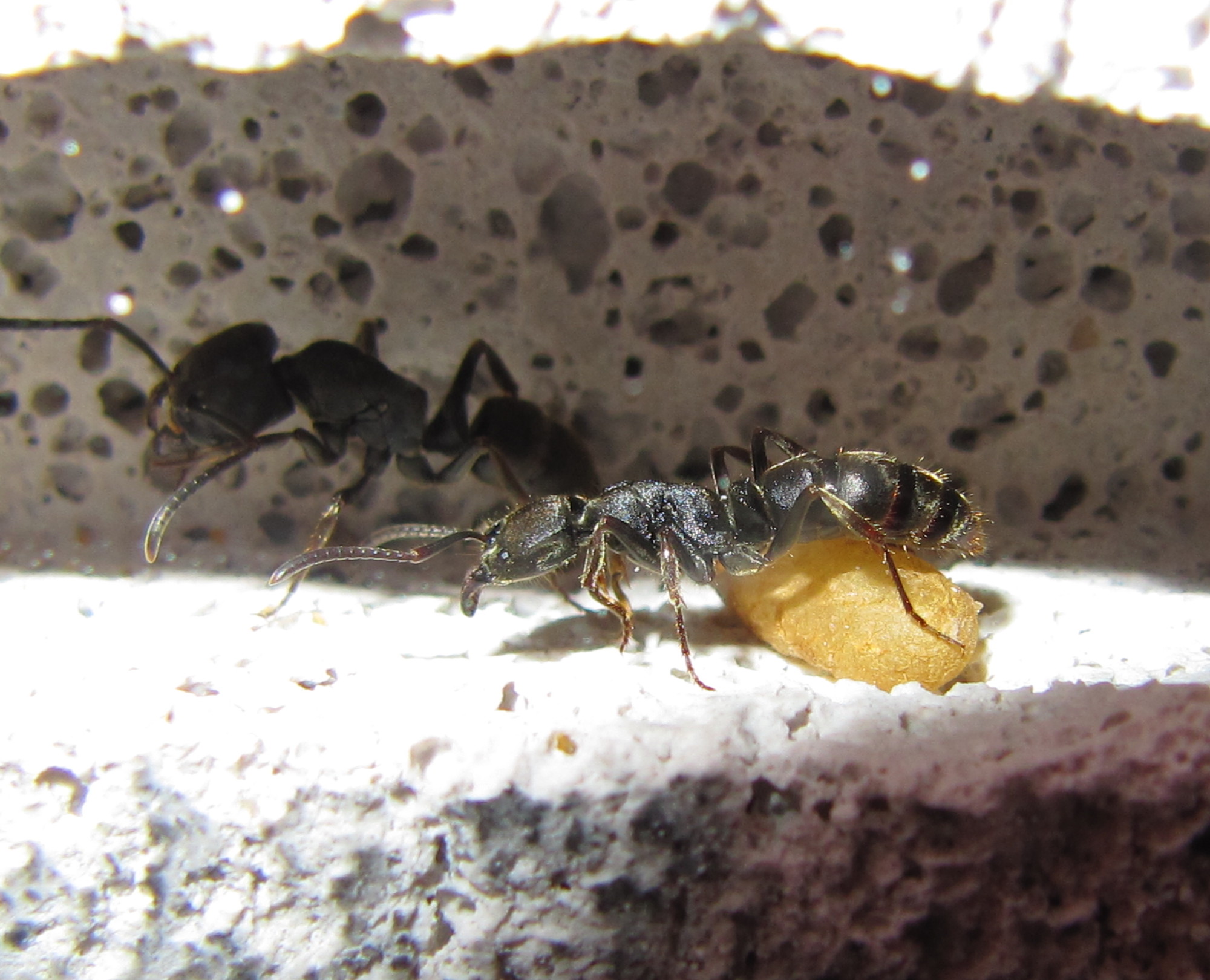 Da ich die Tiere allerdings seit Tagen nicht mehr am Honigwasser sehen konnte, habe ich heute zur Abwechslung mal Zuckerwasser angeboten. Und siehe da, die Ameien zeigten zu meiner Überraschung grosses Interesse am neuen Kohlenhydrate-Angebot. Es kam sogar zu einer Tandemmobilisierung.