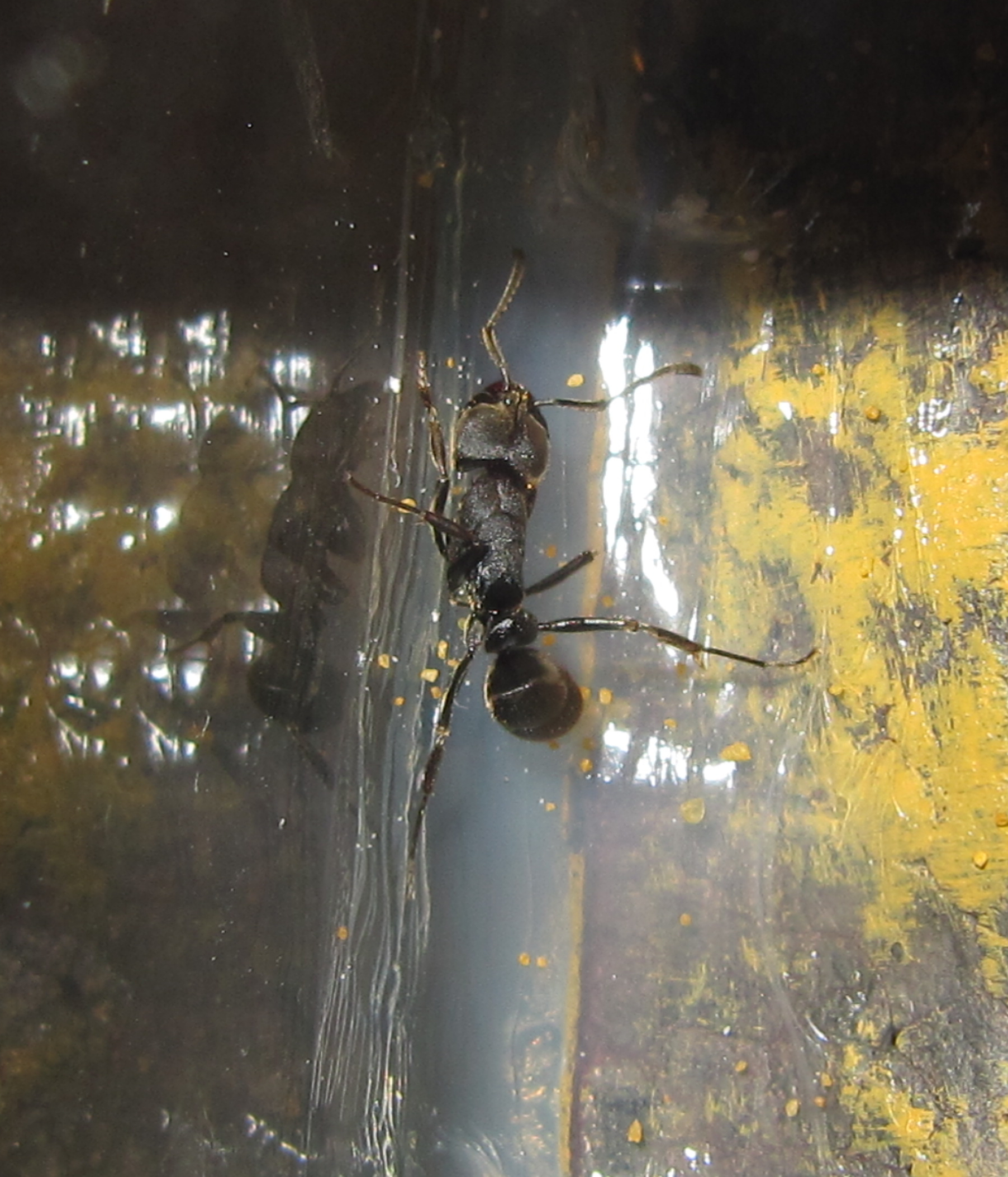 Die Infos im Netz sind zwar eher spärlich, wenn man mit anderen Arten vergleicht, dennoch kommt einiges zusammen: Sicherlich gehört die mittelgrosse Art (8.5 -13mm) nicht zu den „Ausbruchsspezialisten“, denn die schwarzen Tiere können zwar klettern, allerdings nicht an glatten, senkrechten (Glas-)Wänden.