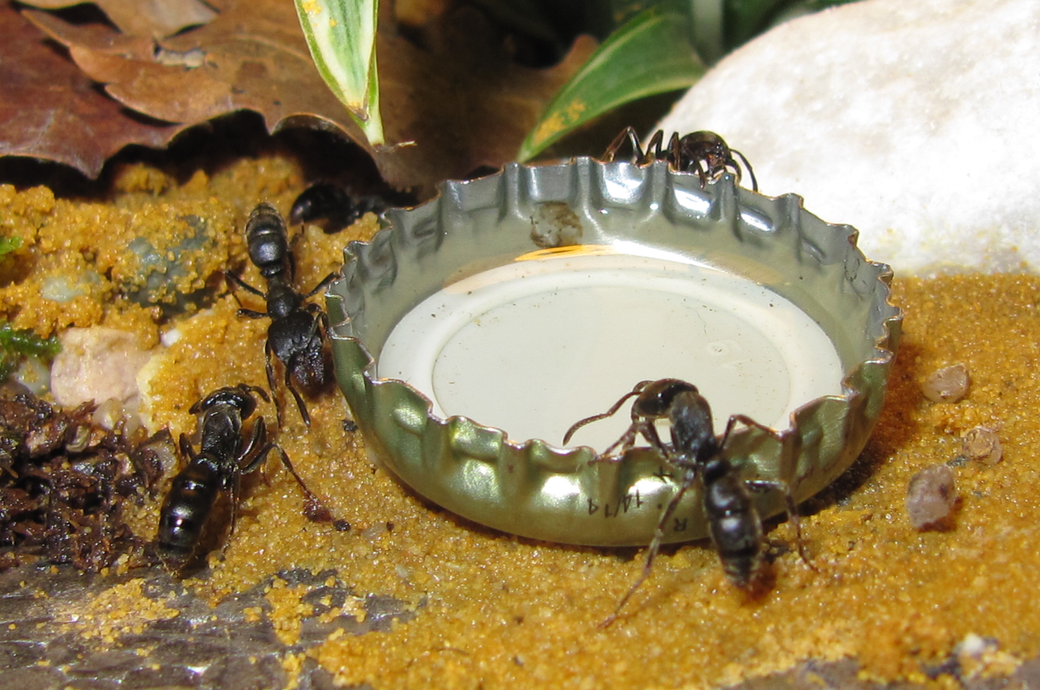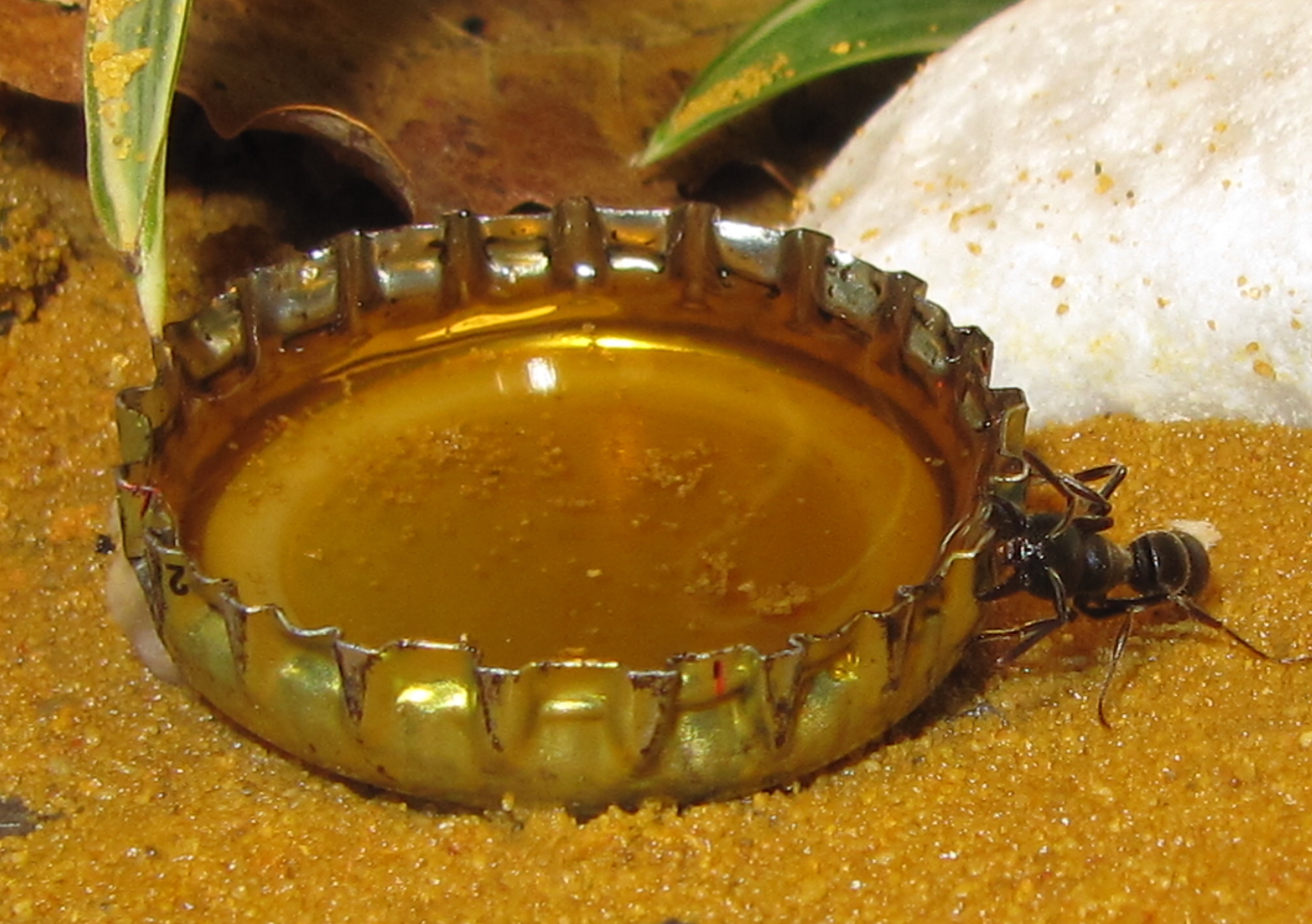 Nun schien es aber so, als ob die moblisierten Ameisen nicht so recht wüssten, was sie mit dem Zuckerwasser anfangen sollten. Der Behälter wurde untersucht, einige Tiere bissen sogar in den Rand. Nur das typische Trinkverhalten, das ich von Ameisen gewohnt bin, blieb zunächst aus.