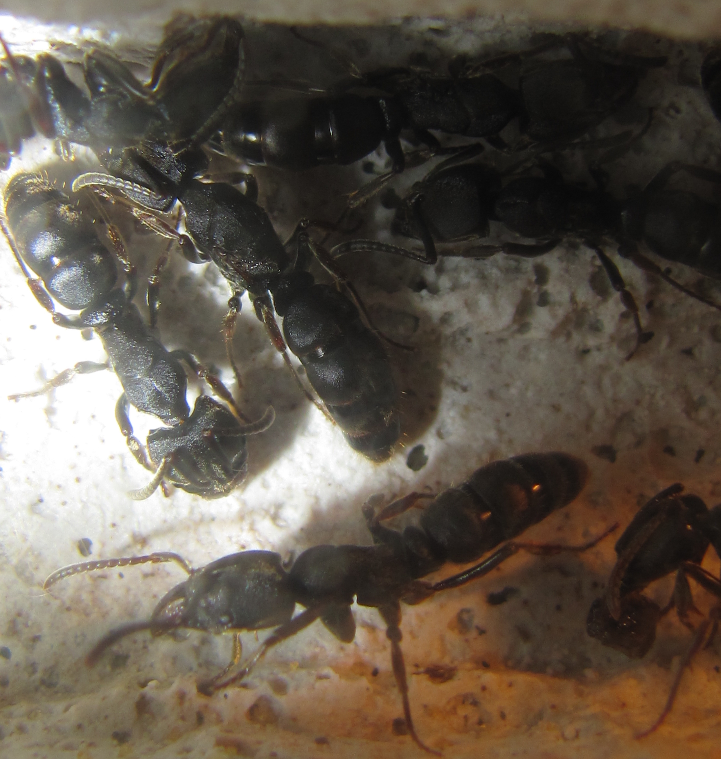 Die Störung durch mein (sofort abgebrochenes) Heizexperiment hat möglicherweise sogar zur Bildung eine Zeignestes irgendwo im Terrarium geführt. Im Nest halten sich momentan nur 15-20 Ameisen auf. Und so viele fouragieren kaum im Terrarium...