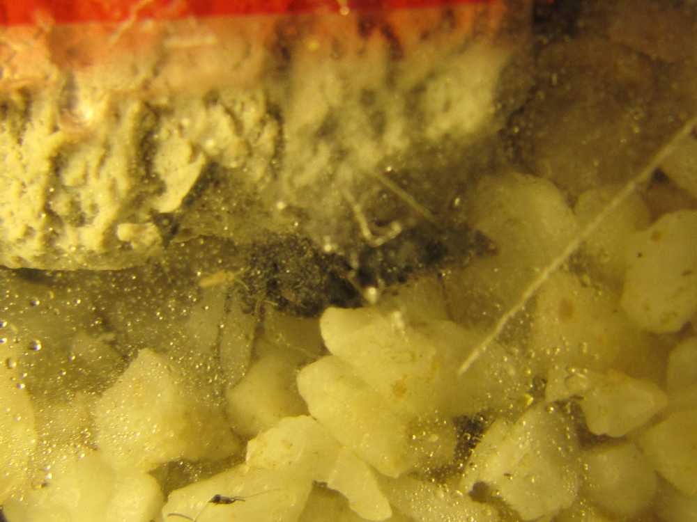 Honigwasser biete ich nur noch 1x die Woche an. Wenn es frisch ist, zeigen die Arbeiterinnen ein geringes Interesse, ansonsten kümmert es sie nicht. Im Gegensatz zu den Springschwänzen, die sich so prächtig vermehrt haben, dass ich sie mit Fruchtstücken abschöpfen kann, um sie als Futter für meine jungen und kleinen Pfeilgiftfrösche zu verwenden. Die Ameisen stören sich keineswegs an der allgegenwärtigen Putzkolonne. Anders als heimische Arten, die ihr Futter zuweilen aggressiv/nervös gegen Springschwänze verteidigen (müssen), halten Ectomomyrmex astutus ihre Beutetiere einfach mit Vorderbeinen und Mandibeln fest. Oft kopfüber hängend. Die Springschwänze können so gar nicht an die Futterinsekten gelangen.