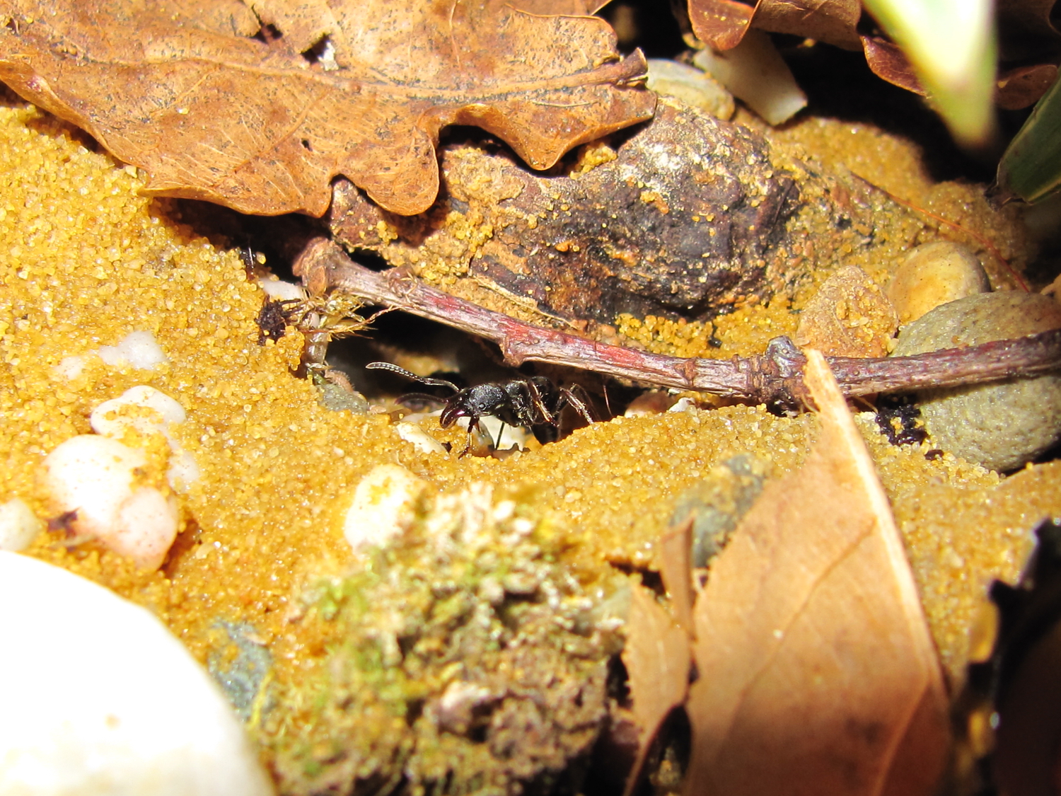 Des Rätsels Lösung: Sie haben ein Zweignest im Kies angelegt! Bemerkt habe ich es, als eine Arbeiterin ein grosses Heimchen nicht in Richtung Nest, sondern mitten ins Terrarium transportierte. Kurz darauf zerrte sie das Heimchen in ein scheinbar viel zu kleines Loch. Nach einigen Minuten war das Futtertier aber ganz darin verschwunden.