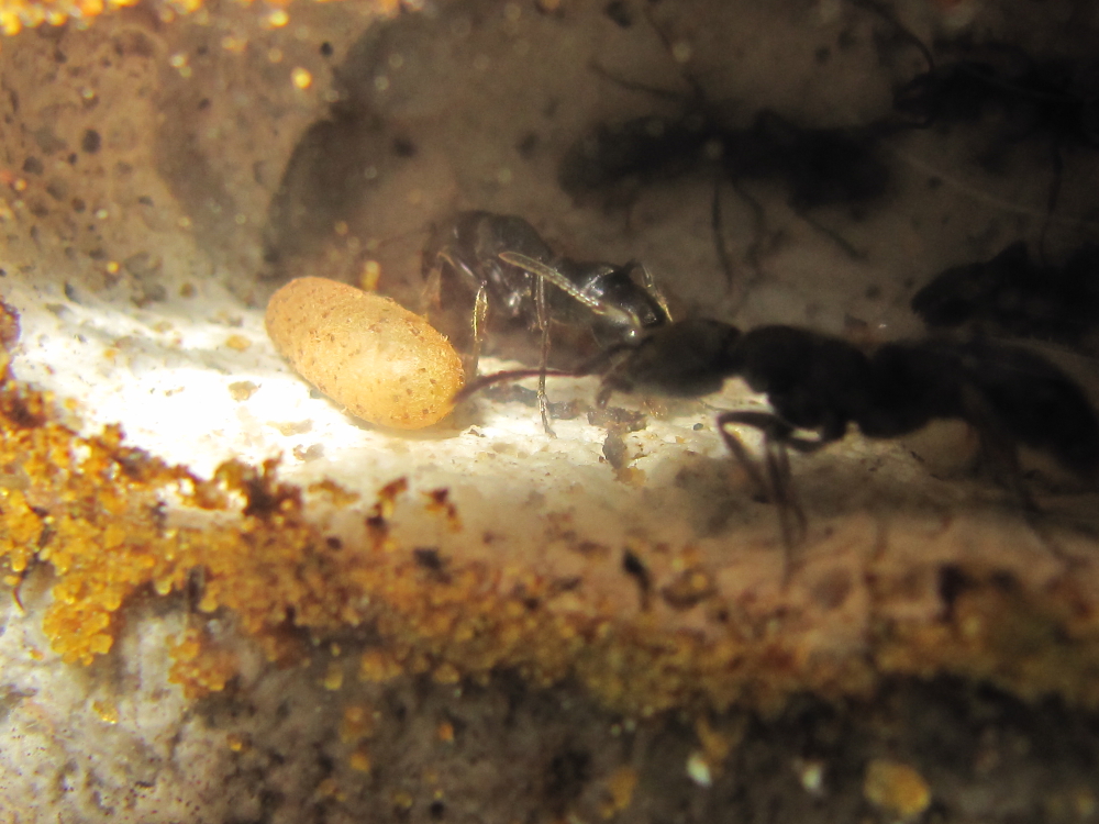 Momentan habe ich über 40 Puppen gezählt. Zudem ist auch die Zahl der Ameisen angewachsen: Es sind über 55 (seit Beginn meiner Haltung könnte ich 16 tote Arbeiterinnen aus den Terrarium bergen). Mindestens ein Eipaket ist ausserdem vorhanden und es gibt über 20 Larven.