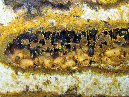 Ich bin etwas unsicher, was da vorgeht. Haben sie die Puppen tatsächlich alle ins Zweignest geschafft, weil dort die besseren Bedingungen herrschen? Ich traue mich nicht nachzuschauen, da ich befürchte, dass die Kammern und Gänge im Kies einstürzen, wenn ich die Wurzel hochhebe, unter der ich das Zweignest vermute.