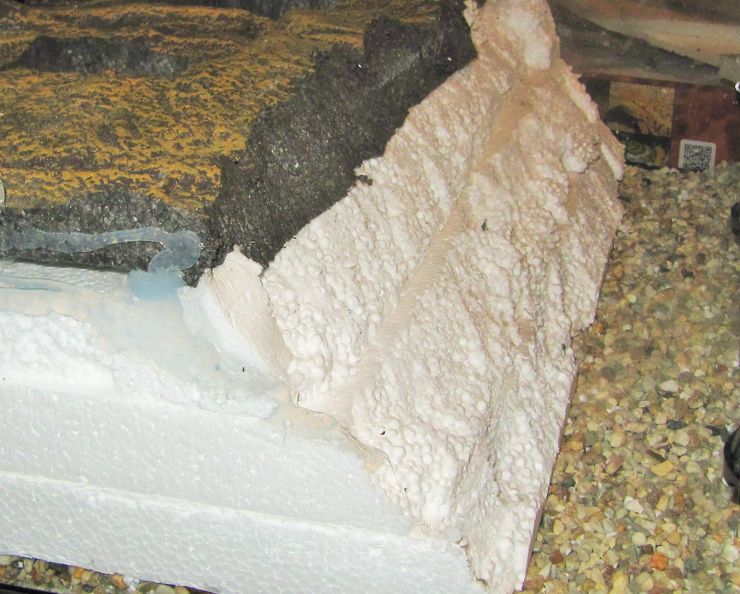 Dieses mal verwende ich die mitgelieferte Rückwand als Bodenplatte. Die darunterliegenden Styroporplatten leiten dann in einem Abhang zum "Burggraben" über. Die unterste Bodenschicht besteht aus Kies, in dem später Wasser (für die Pflanzen und die Luftfeuchtigkeit) steht. Auch das Nest kann über die Schicht bewässert werden.
