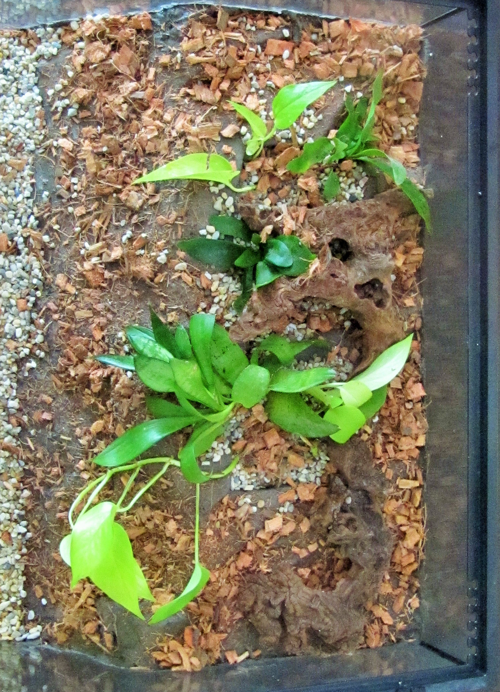 Das Ganze muss jetzt aber noch einige Tage aushärten, bis ich Wasser einfüllen kann und die Ameisen umziehen dürfen. Die Pflanzen erhalten ihr täglich Brot bis dahin mit dem Wasserzerstäuber auf die Blätter. Die Streuschicht werde ich noch mit Eichenlaub ergänzen. Auf Sand will ich zumindes am Anfang verzichten. Damit mir Ectomomyrmex astutus nicht gleich wieder die Sicht vermasseln...